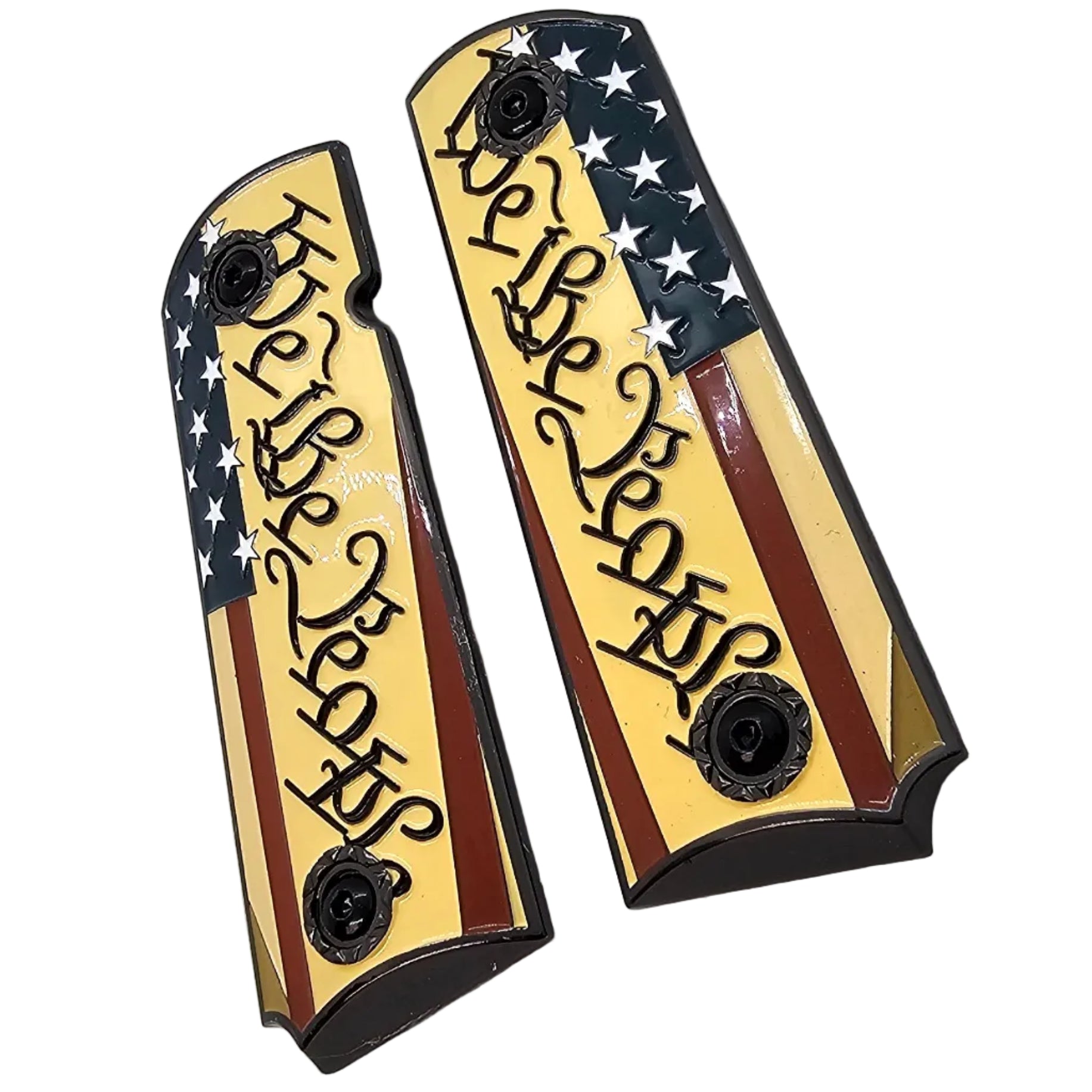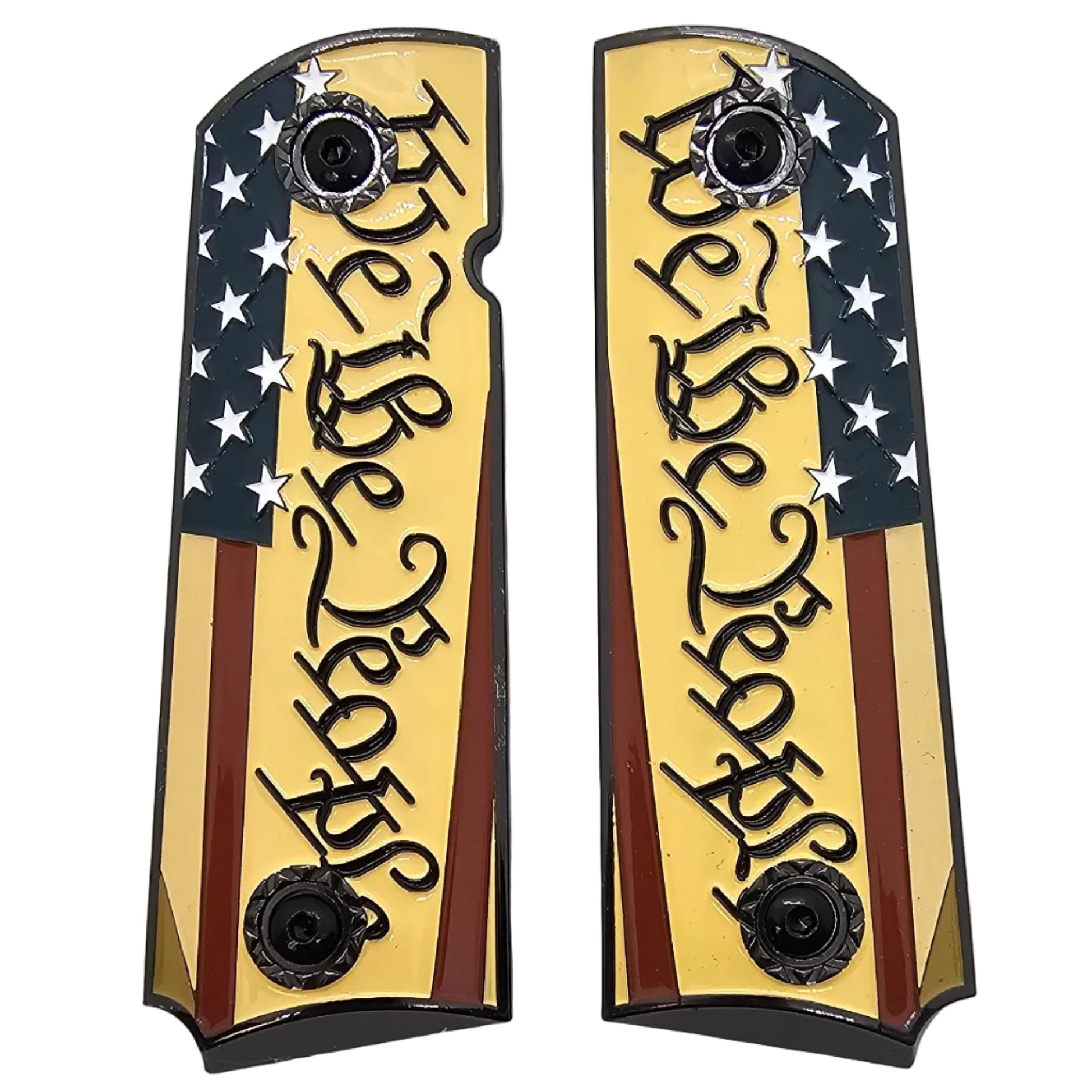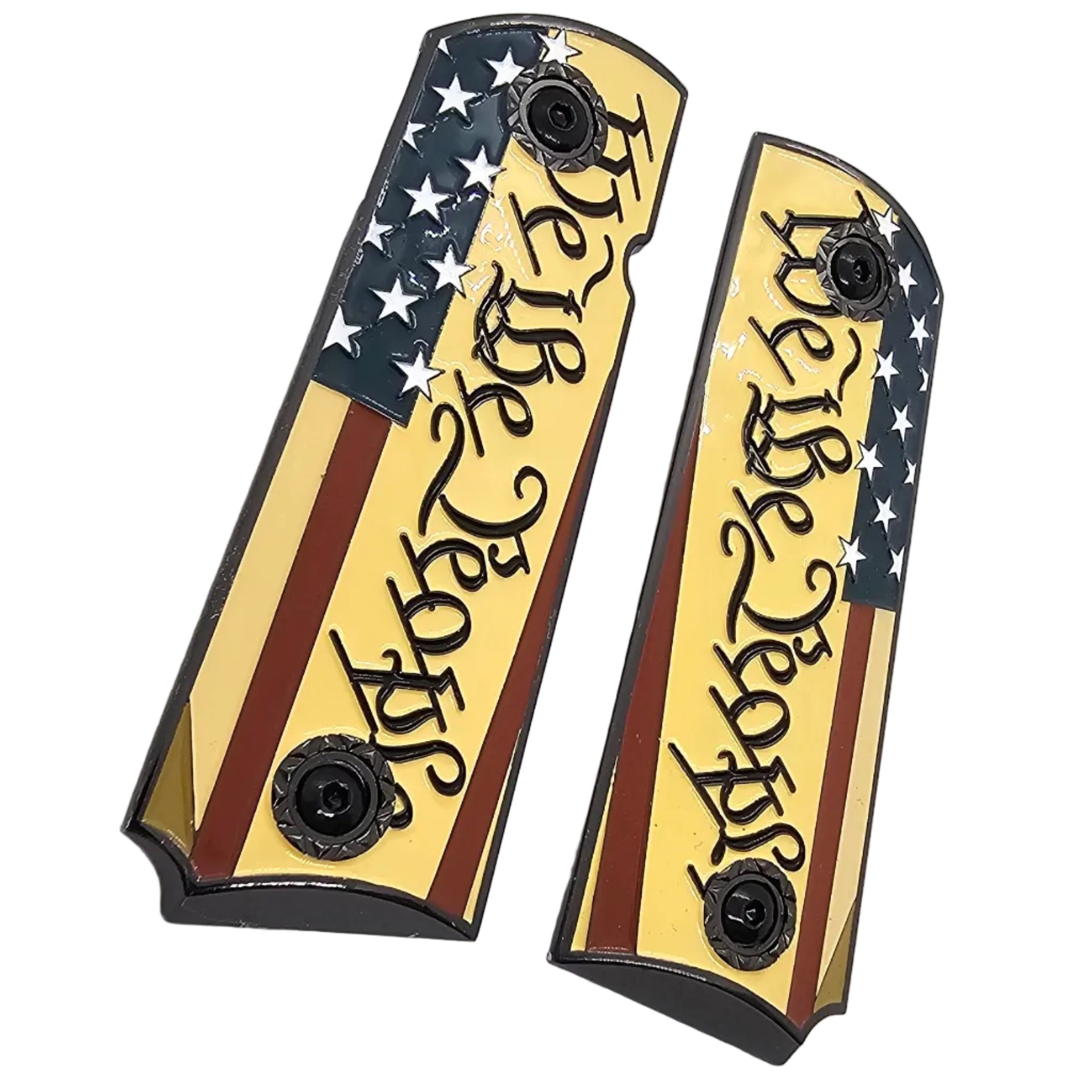 • 1911 Full-Size Metal Grips Black – “We The People” USA Flag Enamel (Ambi Cut) + Screws