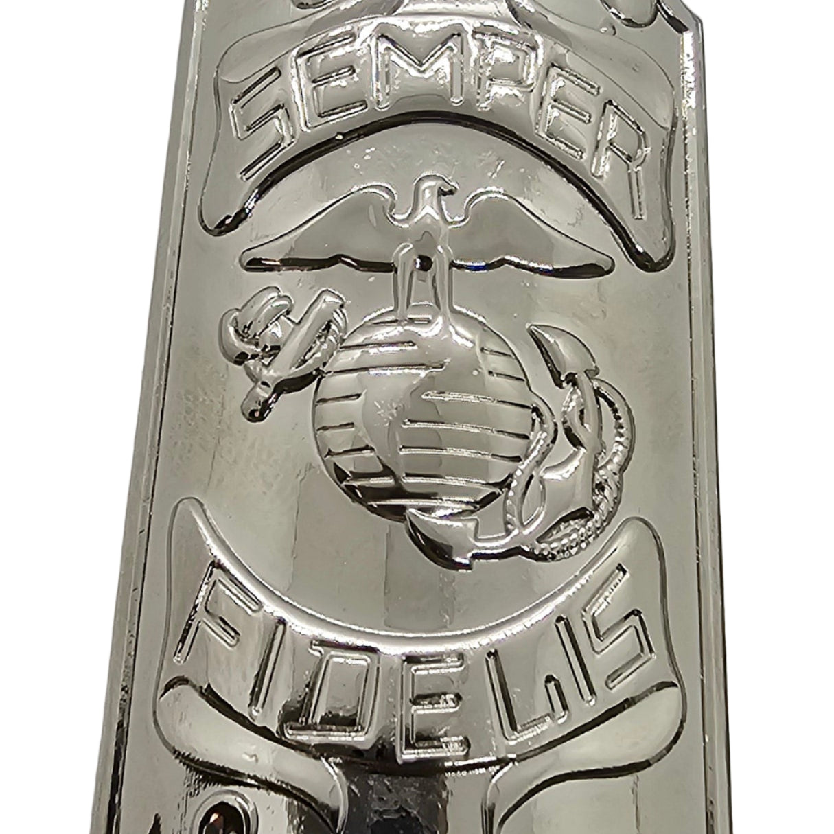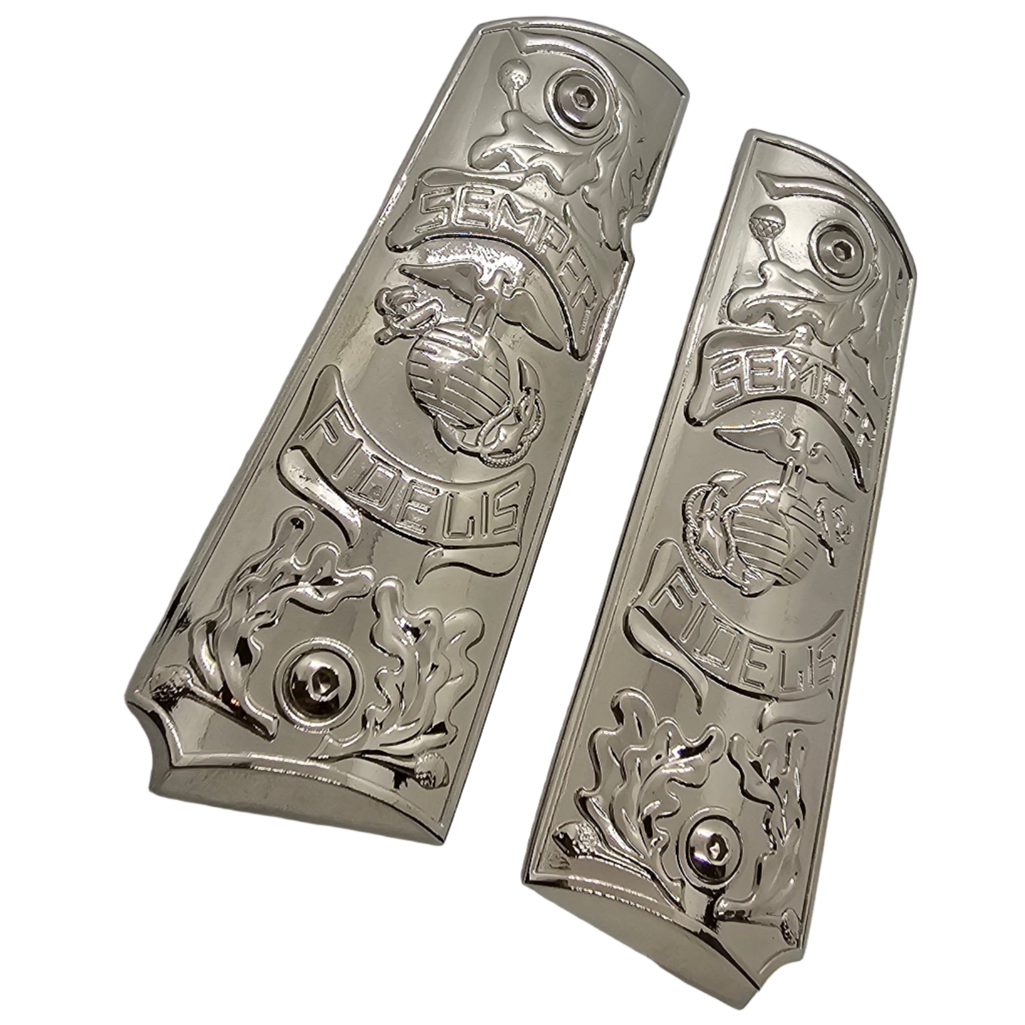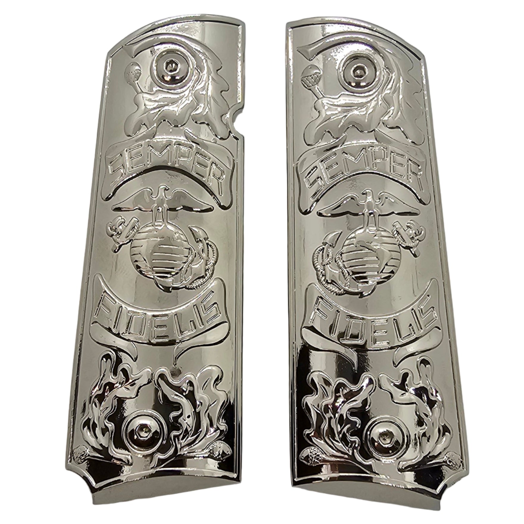 • 1911 Full Size Metal Grips Chrome – “Semper Fidelis” Design – With Screws, No Ambi Cut
