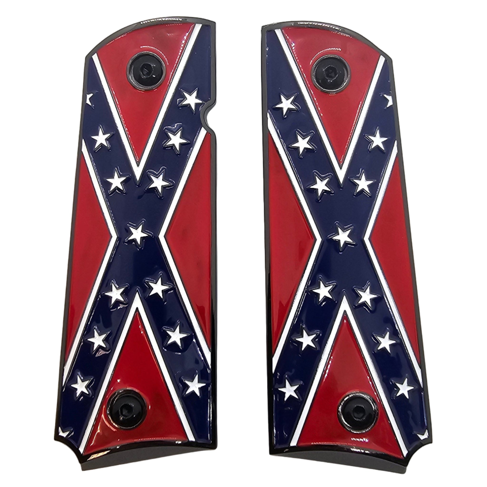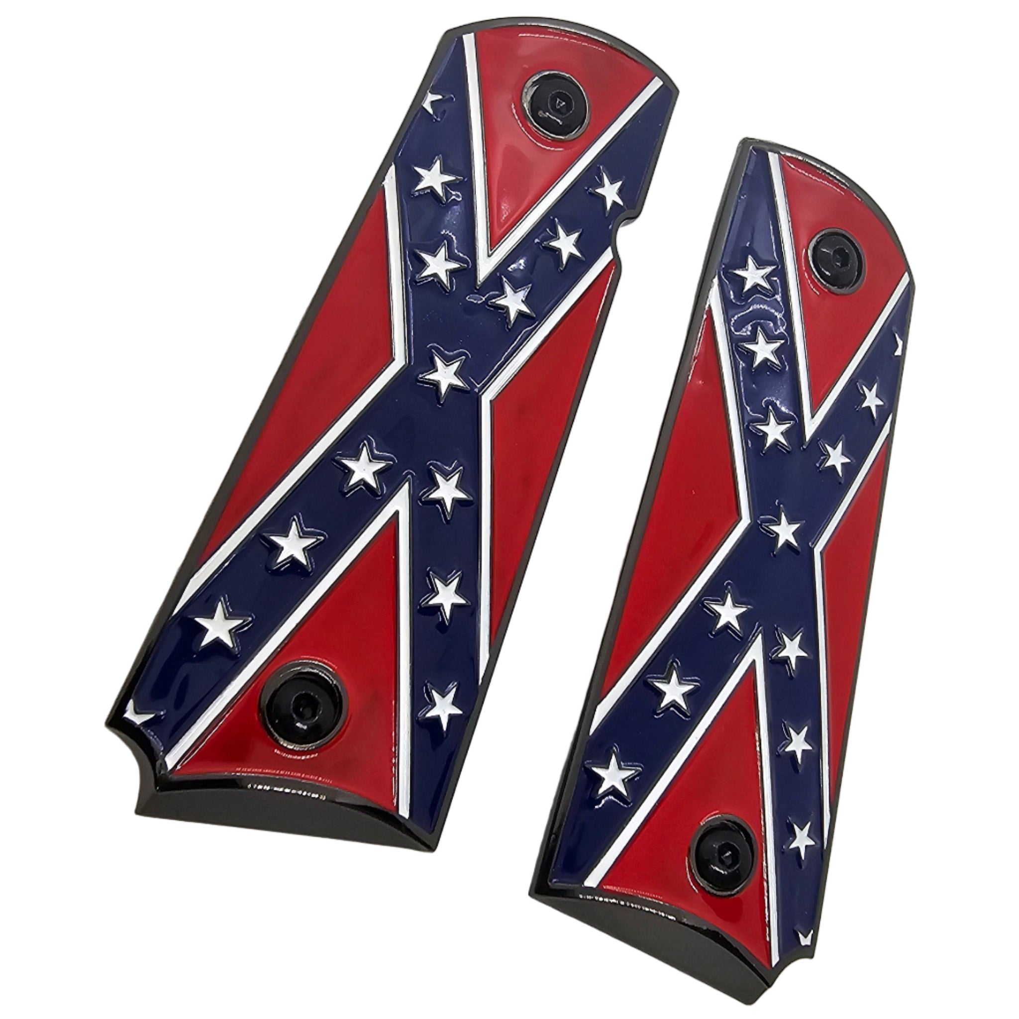 Give your 1911 a standout look with these full-size metal grips. Each panel features a detailed flag-style design set into a glossy enamel surface, surrounded by a polished black-plated border/base that really pops on the pistol.