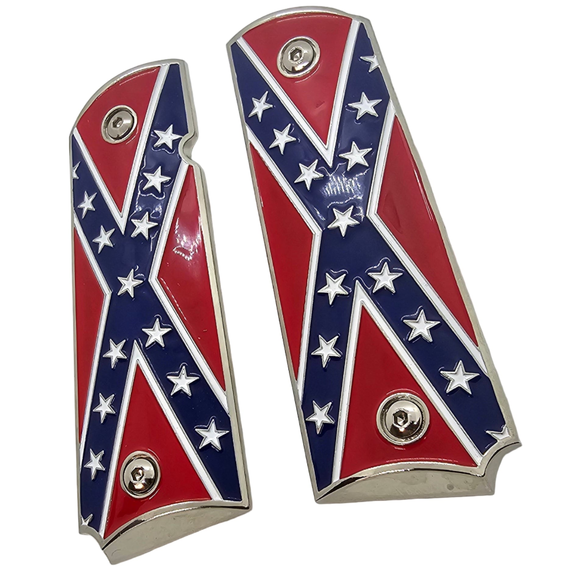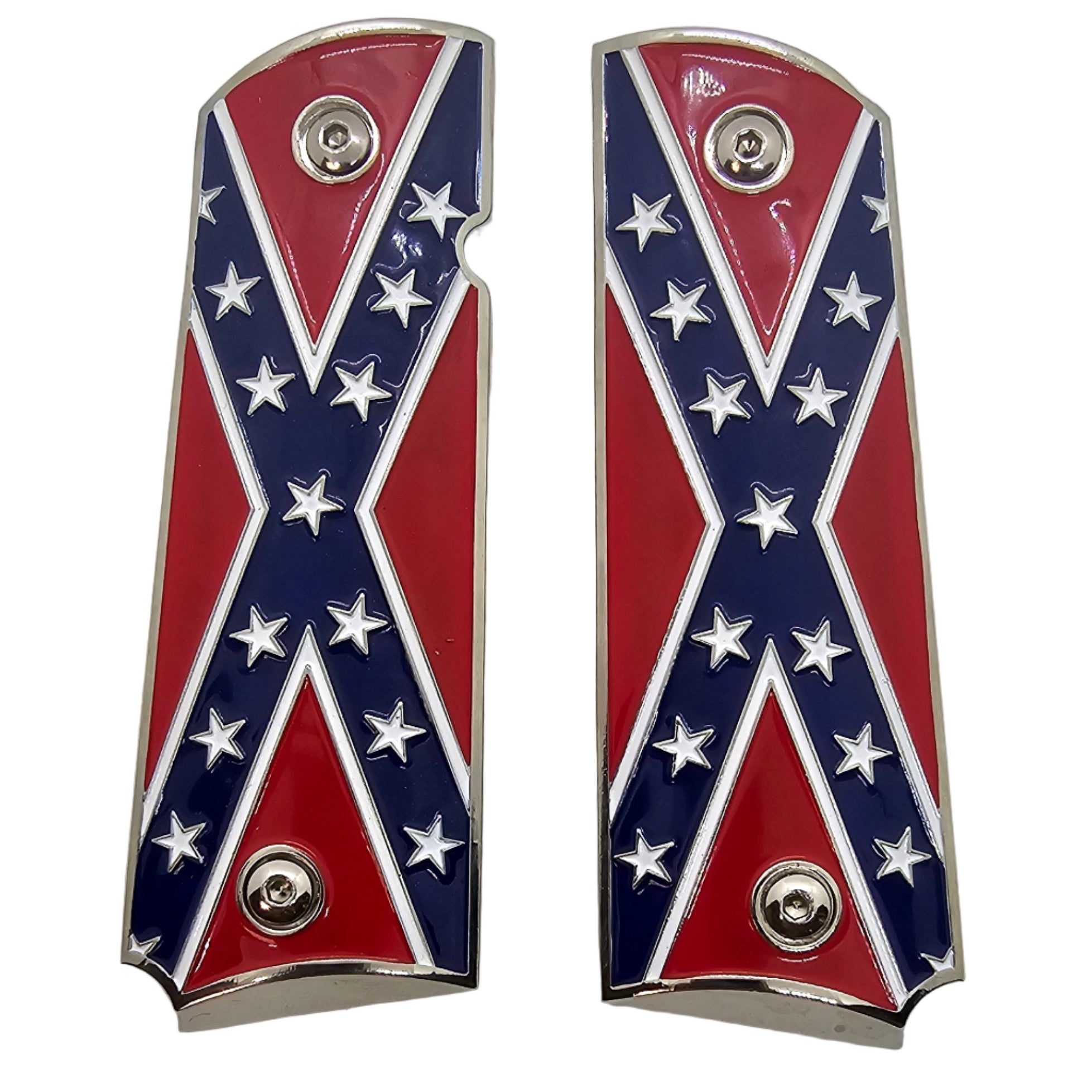 Give your 1911 a standout look with these full-size metal grips. Each panel features a detailed flag-style design set into a glossy enamel surface, surrounded by a polished chrome-plated border/base that really pops on the pistol.