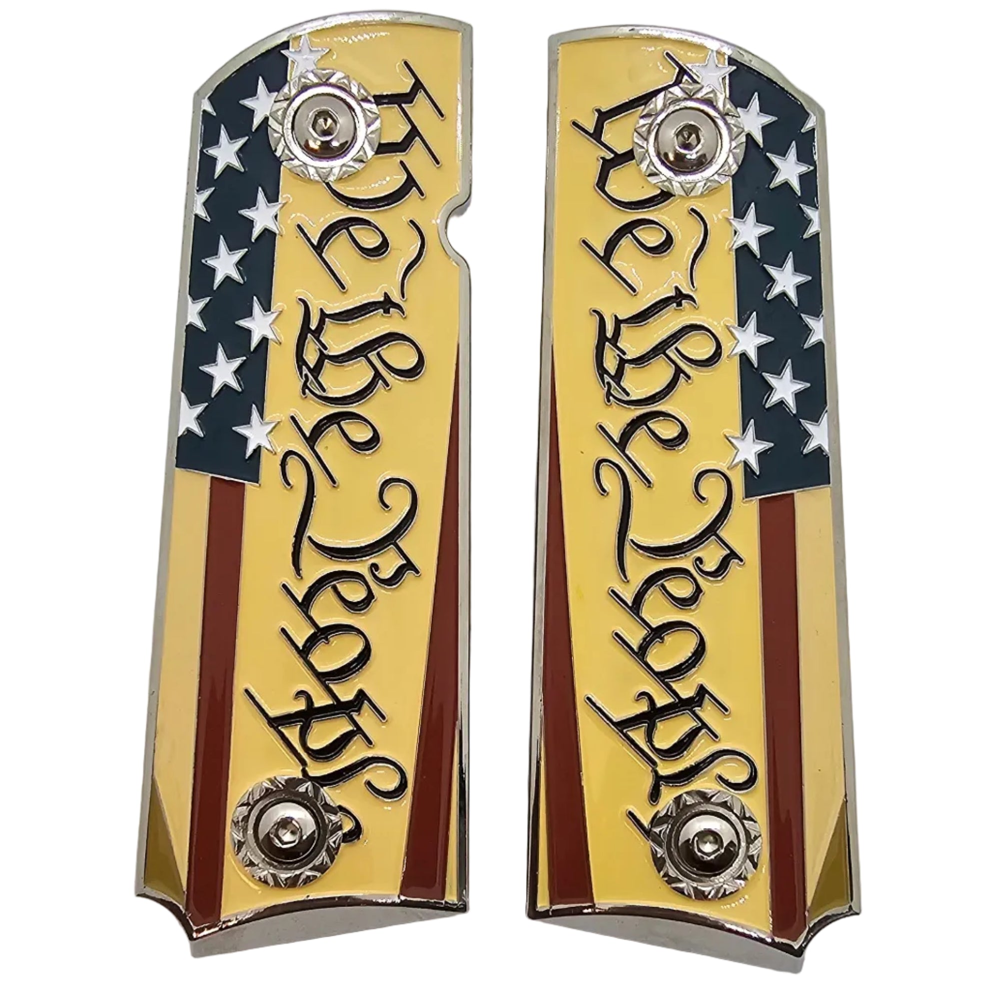 • 1911 Full-Size Metal Grips Nickel – “We The People” USA Flag Enamel (Ambi Cut) + Screws