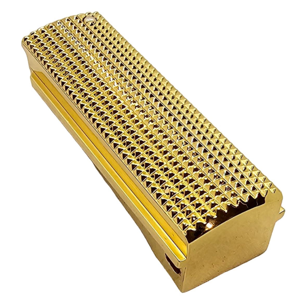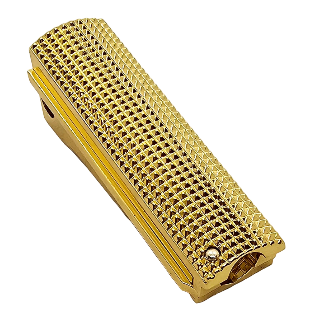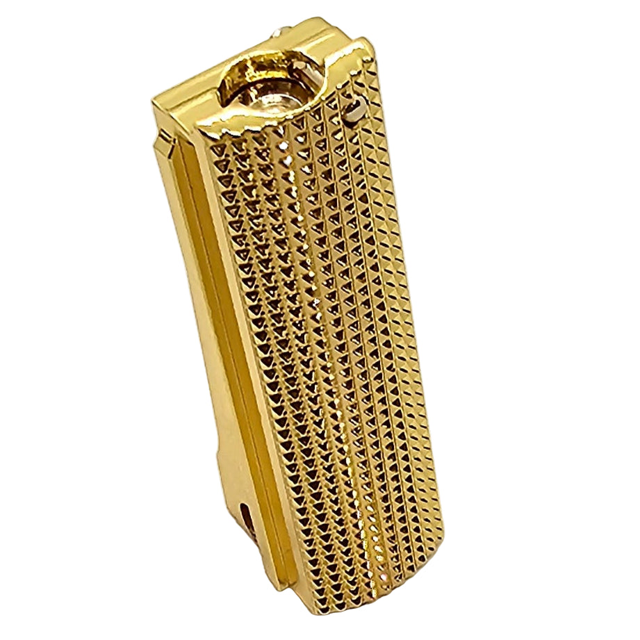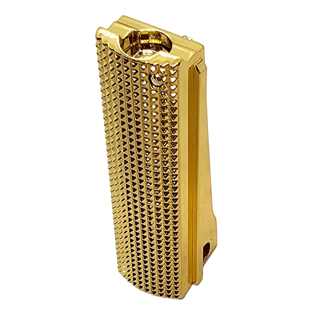 Add a premium touch to your 1911 with this full-size mainspring housing, crafted from solid steel and finished with a polished gold plating. Featuring intricate checkered engraving, this upgrade combines durability with high-end design for a unique custom look.