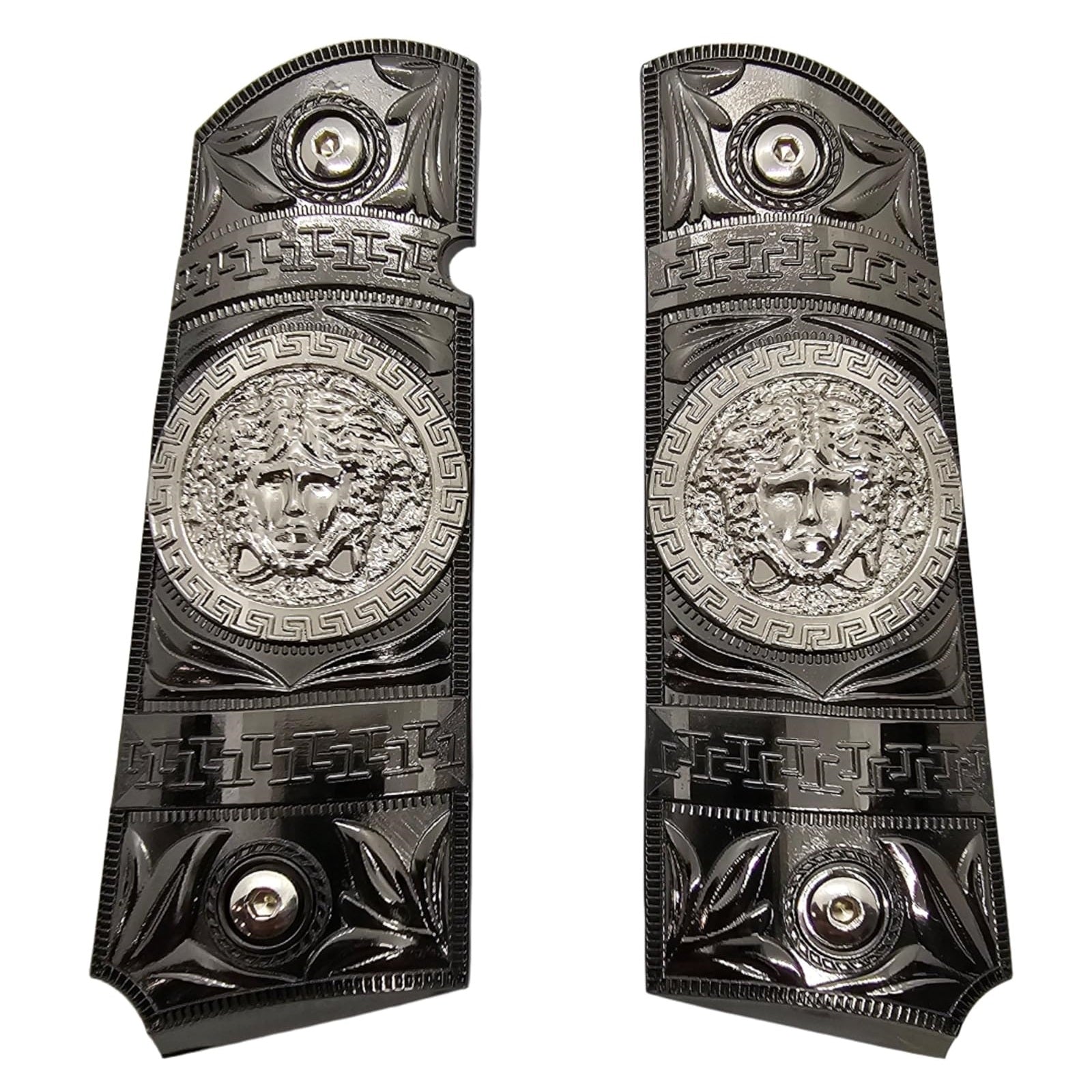 Enhance your 1911 with these Black & Silver Medusa Metal Grips, a stunning fusion of mythology and modern craftsmanship. Made from durable cast metal alloy, these grips showcase a detailed silver Medusa emblem surrounded by Greek key and laurel engravings. The deep black finish paired with polished silver highlights creates a sleek, bold, and luxurious aesthetic worthy of any collector.