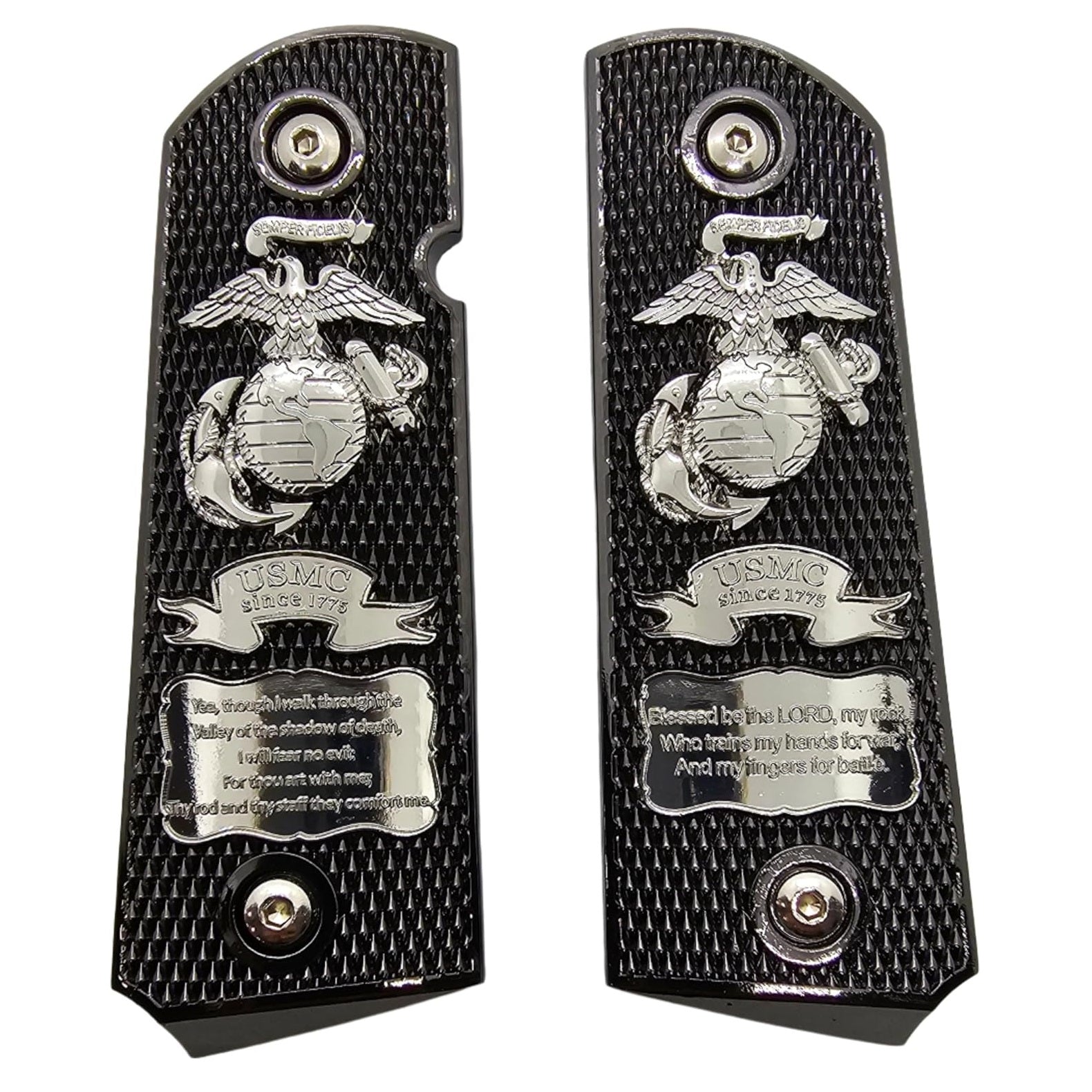 Honor military pride and craftsmanship with these Black & Silver Military Eagle Globe Metal Grips. Made from durable cast metal alloy, these grips feature a detailed eagle, globe, and anchor emblem above engraved scripture panels. The checkered texture provides excellent grip while the polished silver highlights add a refined contrast against the black background, making these grips both functional and symbolic.