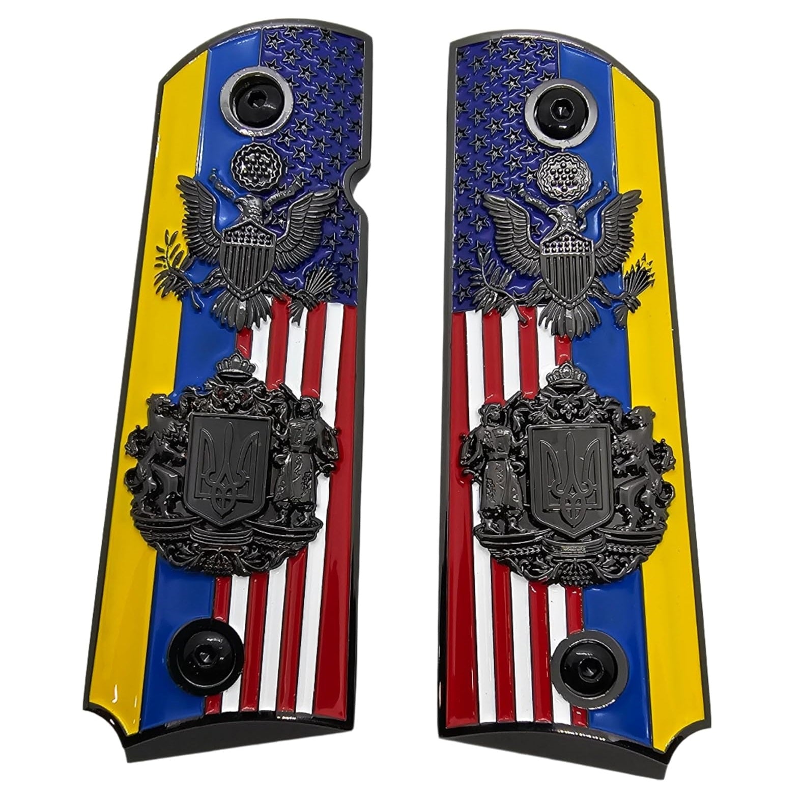 Show unity and power with these Black USA–Ukraine Flag 1911 Metal Grips. Featuring both nations’ flags and raised emblems — the American Great Seal and the Ukrainian Trident — this design honors strength, freedom, and shared resolve. The glossy enamel finish contrasts beautifully with the black alloy trim, giving your 1911 a bold, tactical look while maintaining top-tier craftsmanship and durability.