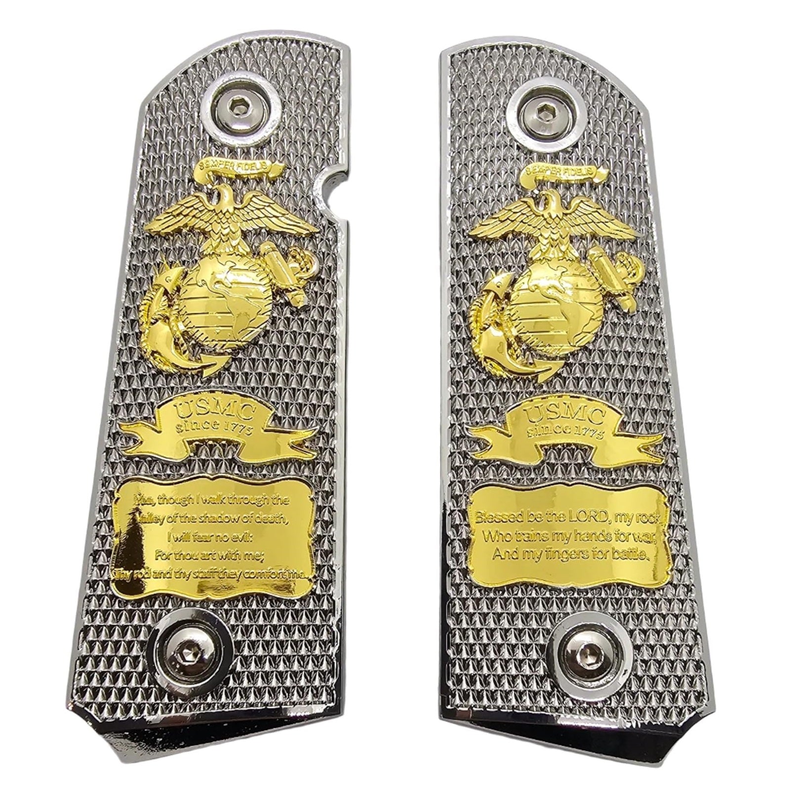 Show pride and precision with these Chrome & Gold Military Eagle Globe Metal Grips for your 1911. Built from durable cast metal alloy, these grips feature a detailed eagle and globe emblem with engraved scripture panels. The mirror-polished chrome base paired with radiant gold highlights creates a bold, patriotic look that’s both durable and eye-catching.