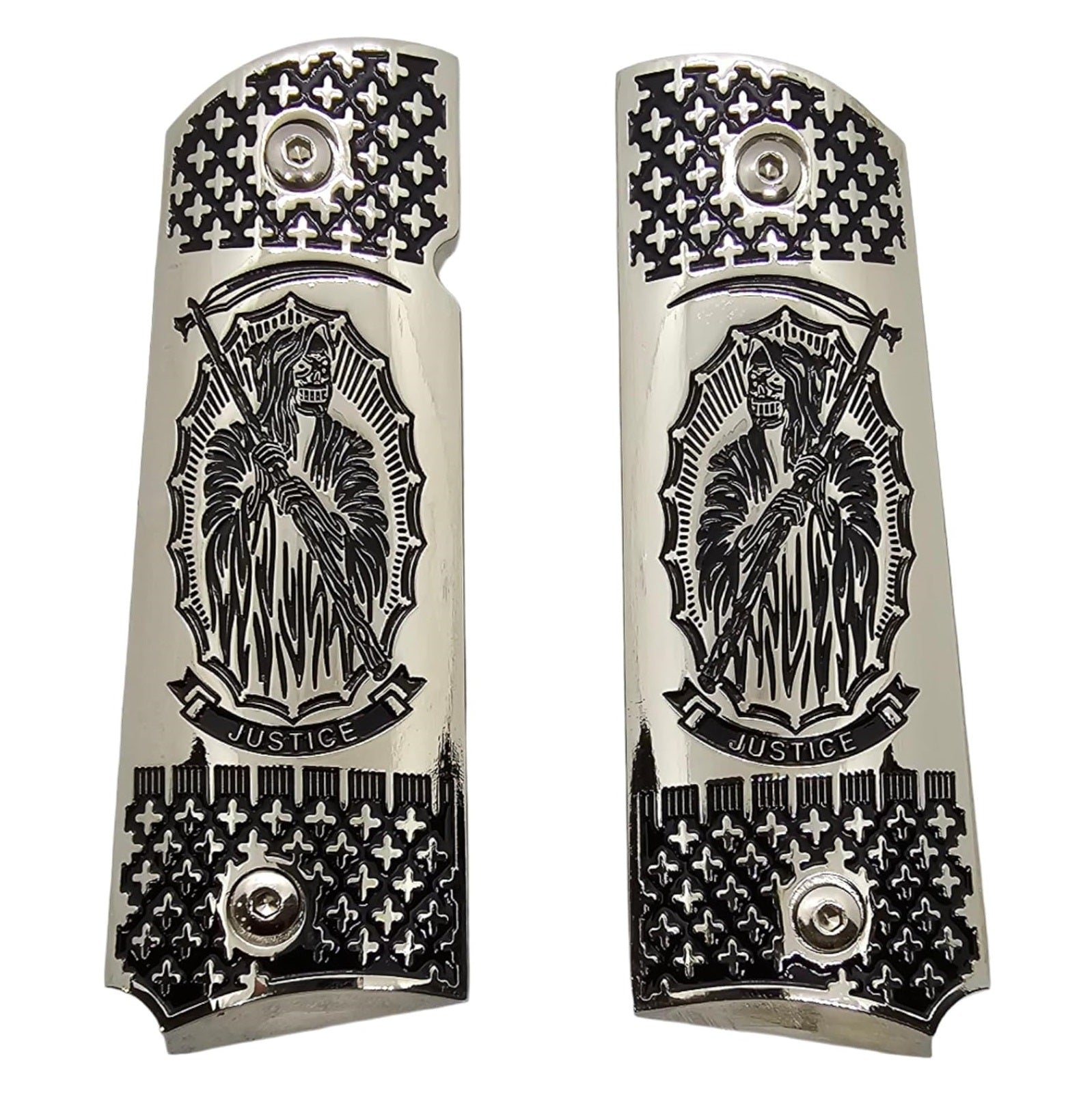 Bring power and symbolism to your 1911 with these Chrome Metal Grips featuring the “Justice Reaper” Design. The detailed engraving depicts the Reaper holding the scales of justice, symbolizing balance and authority. Finished in polished chrome with deep black accents, these grips add both intimidation and elegance to your firearm. Built from durable cast metal alloy, they provide a premium feel with long-lasting durability.