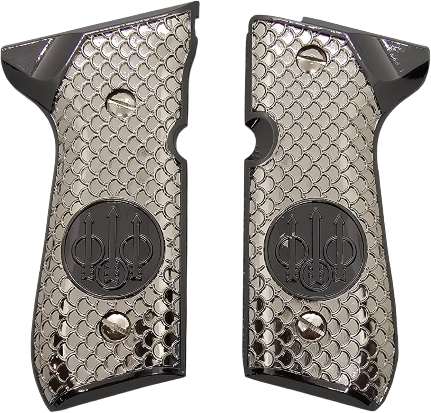 Upgrade your Beretta with these silver metal grips featuring a textured scale design and black Beretta logo medallion. Perfectly fitted for full-size 92 and 96 models, these grips offer an elegant finish, durable build, and improved handling performance.