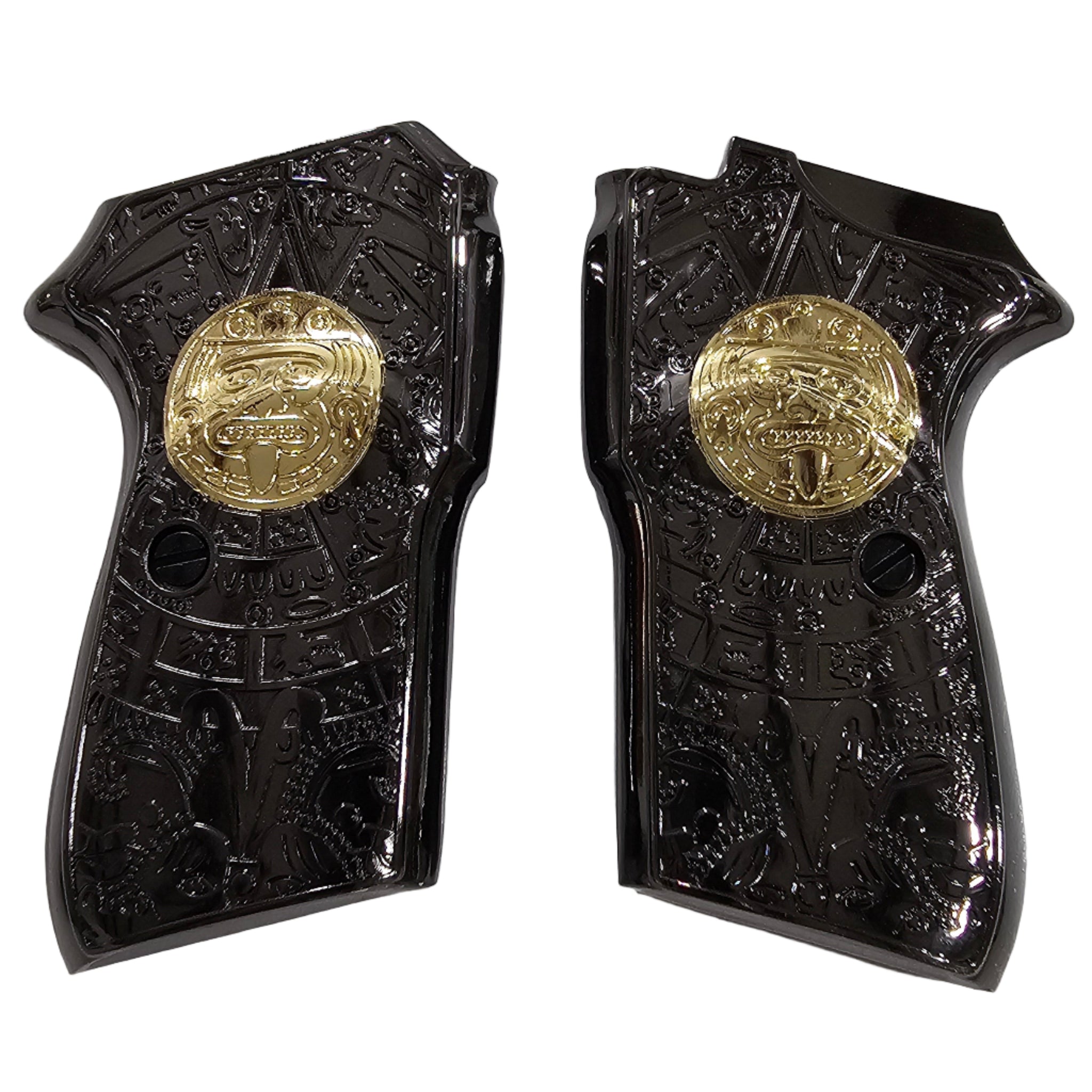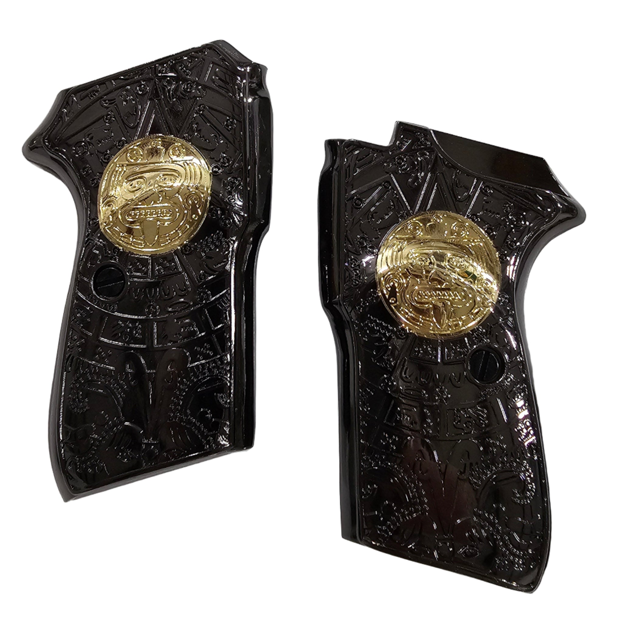 Give your Bersa Thunder .380 ACP a bold new look with these black gold plated metal grips, featuring an intricate Aztec calendar engraving with gold medallions. Each pair is precision-machined for a perfect fit, combining durability, artistry, and comfort in one design.