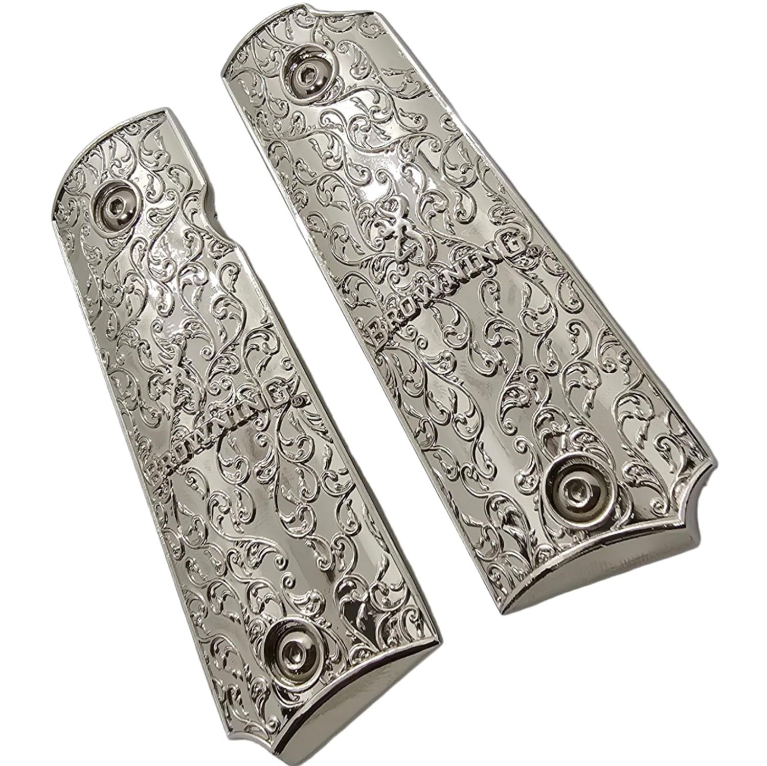 Enhance your Browning 1911-22 or 1911-380 with these Chrome Metal Ornate Scroll Design Grips. Crafted from durable metal and polished to a mirror-like chrome finish, these grips deliver both luxury and performance. The detailed scroll engraving adds a touch of classic artistry, while the “BROWNING” logo gives it an authentic, premium look.