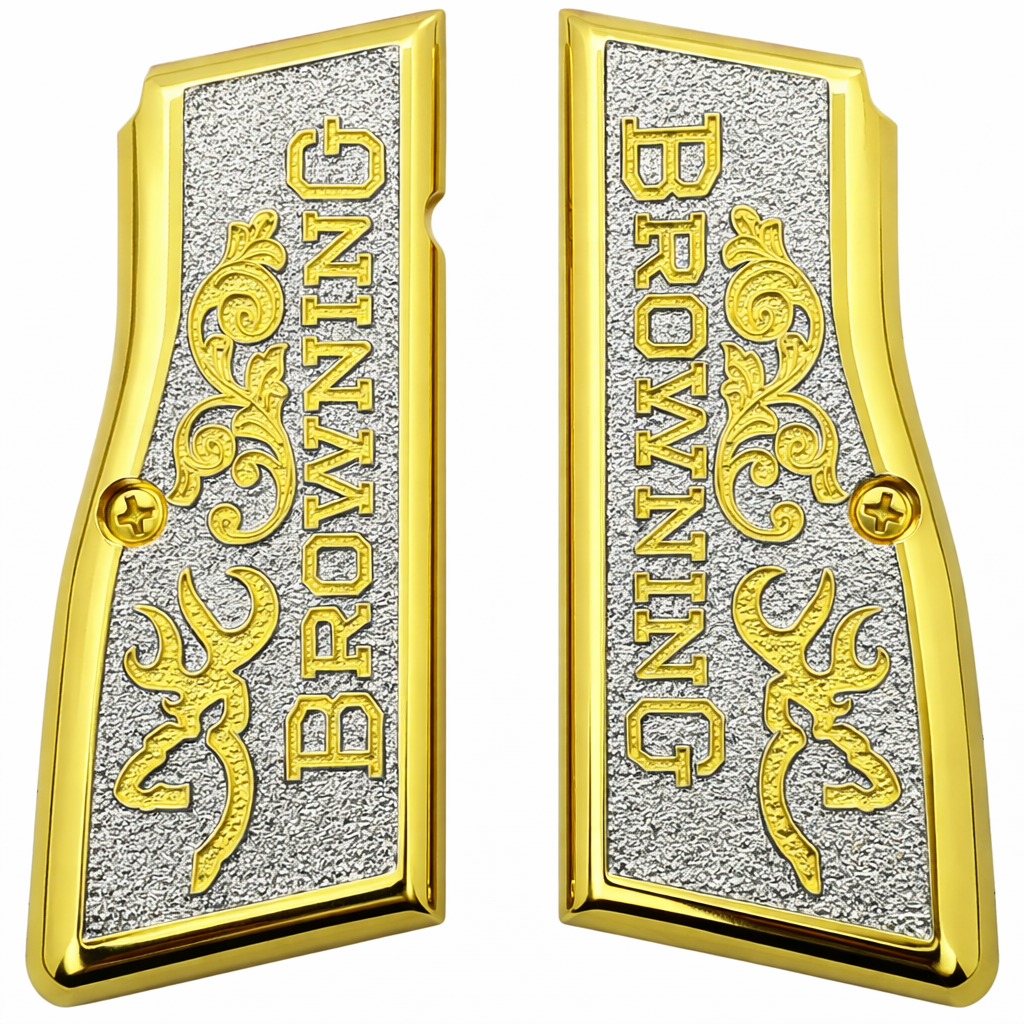 Elevate the appearance of your Browning Hi Power or Tisas Regent BR9 with these Gold and Nickel Plated Scroll Texture Metal Grips. Featuring a striking two-tone contrast with raised gold “BROWNING” lettering and scrollwork over a textured nickel base, these grips bring luxury, precision, and timeless craftsmanship to your firearm.