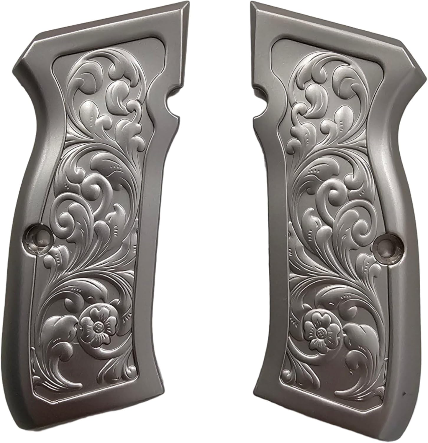 Bring timeless style to your CZ-series frame with these brushed nickel metal grips, custom-crafted for CZ-75, CZ-85, CZ-75B, and SP-01 full-size models. Finished in a satin-textured brushed nickel tone with elegant floral scroll engraving, these grips combine durability with classic sophistication.