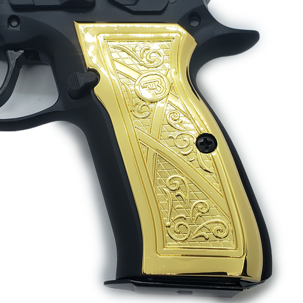 • Gold-Plated CZ-75 / CZ-85 Full-Size Metal Grips – Geometric & Scroll Engraved Design with Matching Screws