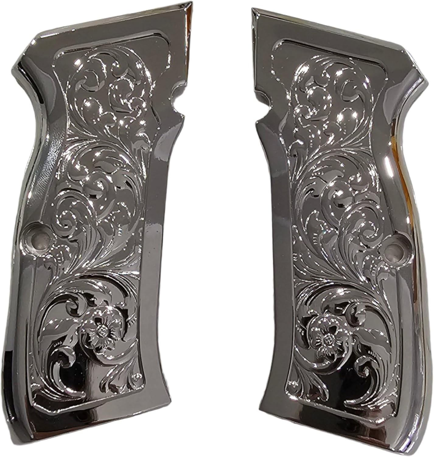 Each grip panel is CNC-machined for a perfect fit and polished to a flawless mirror shine. The set includes matching chrome screws for a complete, cohesive look. Perfect for collectors, show builds, or decorative display models.