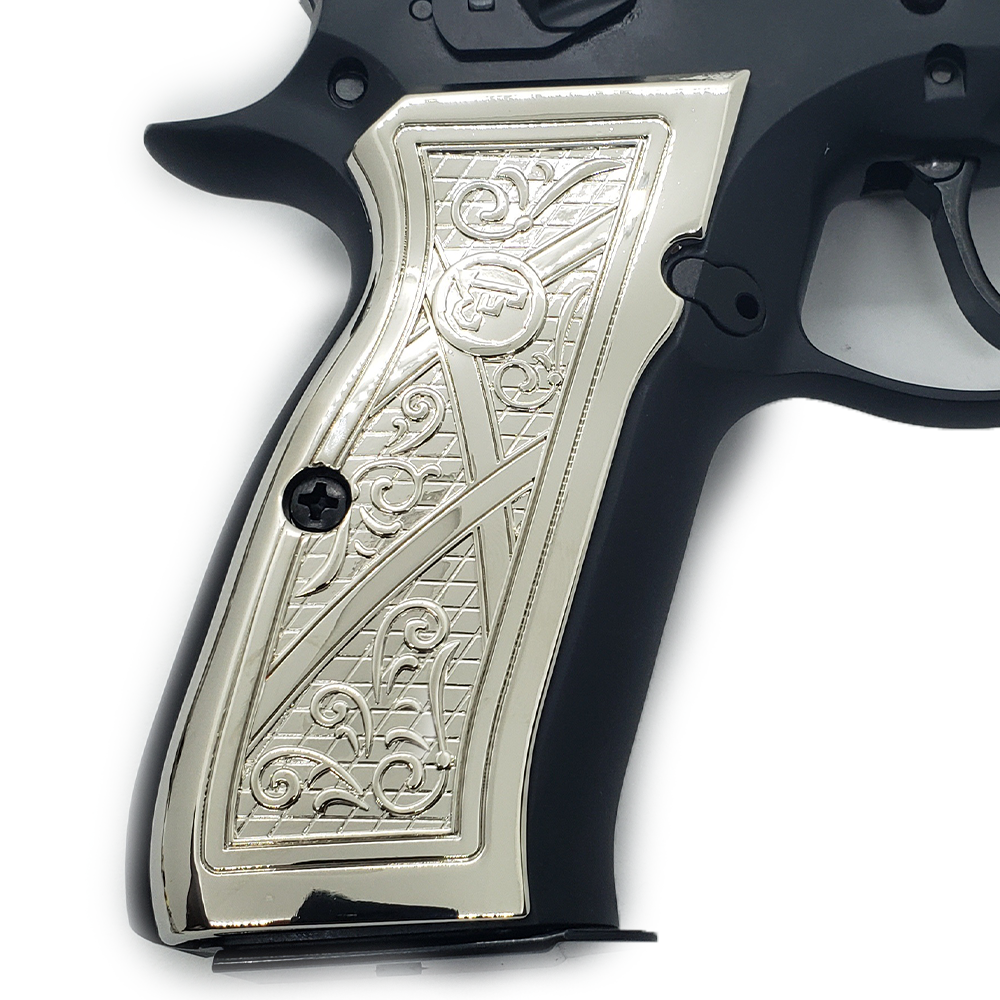 Enhance your CZ-series build with these nickel-plated metal grips, precision-crafted for CZ-75, CZ-85, CZ-75B, and SP-01 full-size models. This design features a stunning geometric lattice and scroll engraving finished in a reflective nickel tone — offering a perfect balance of elegance and modern styling.