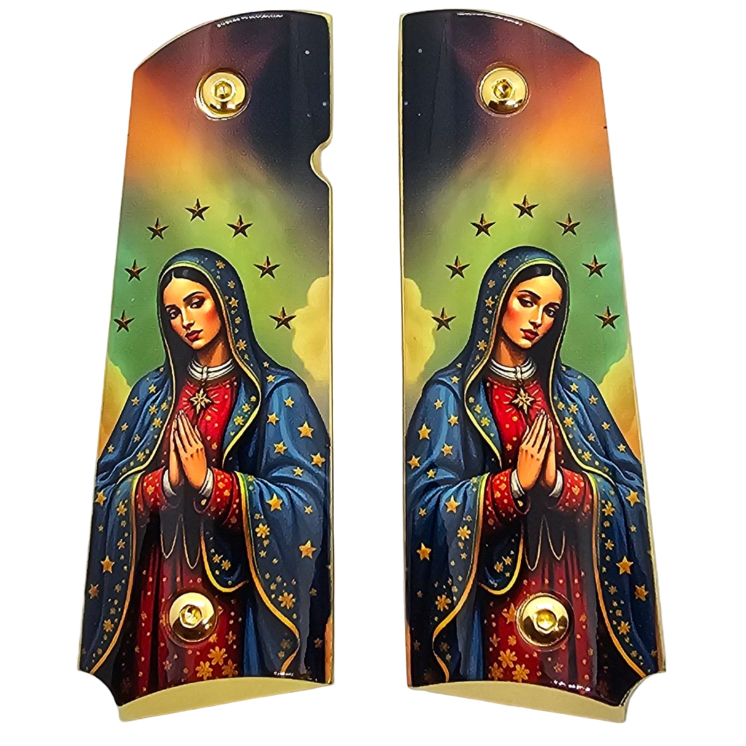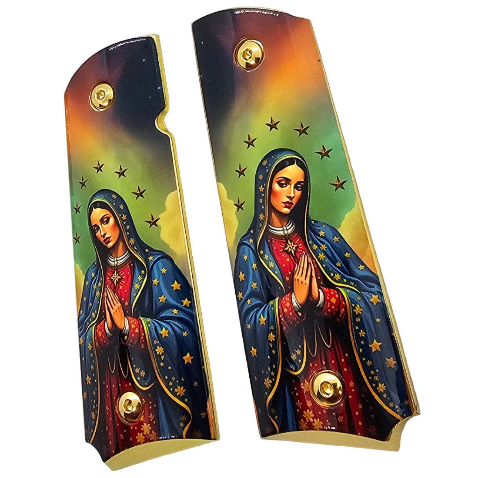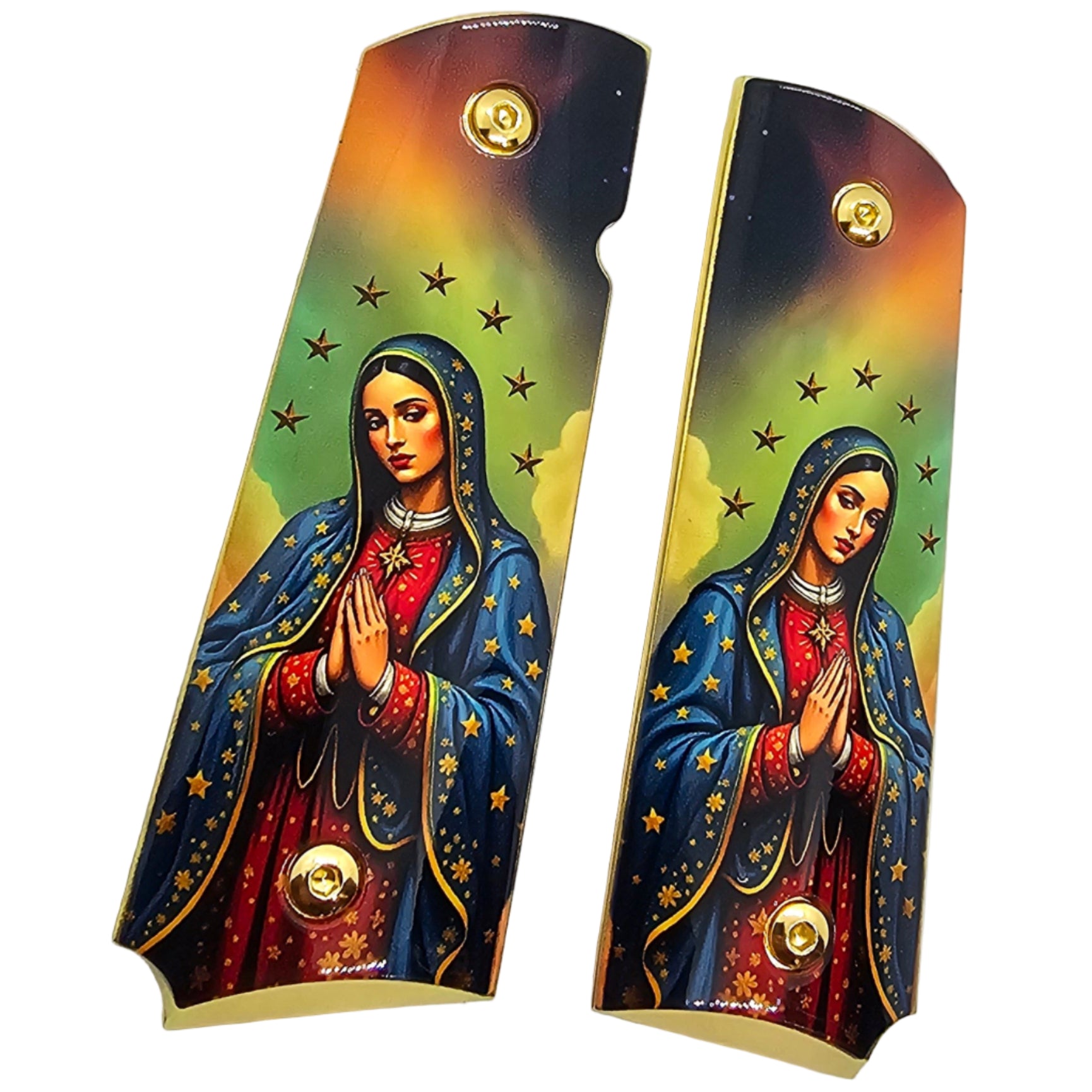 These grips feature a detailed Virgin Mary design, with rich colors of deep blue, red, and gold against a glowing background, symbolizing faith and devotion. Each set is a blend of artistry and durability, making them perfect for collectors and enthusiasts. Includes 4 gold-plated screws for easy installation.