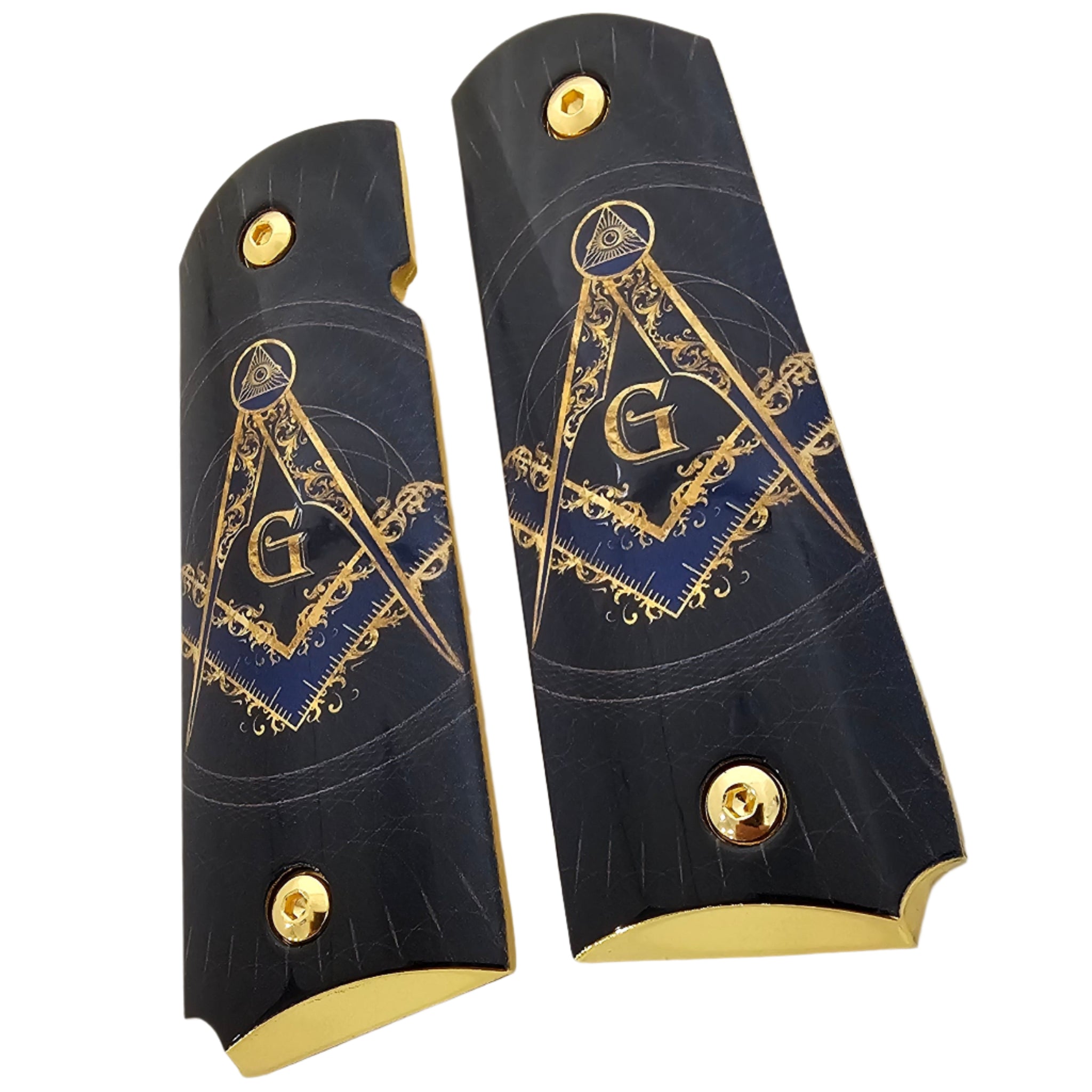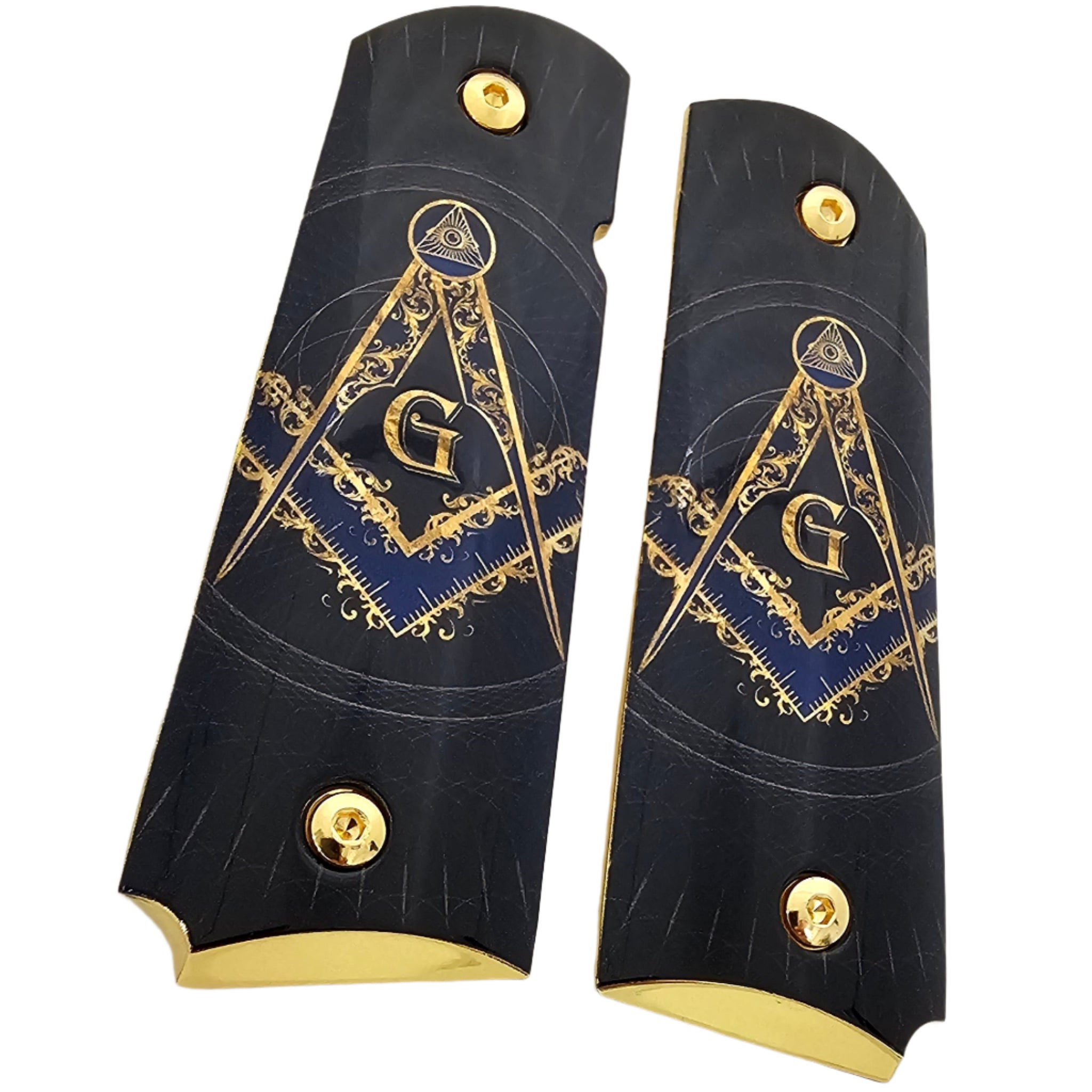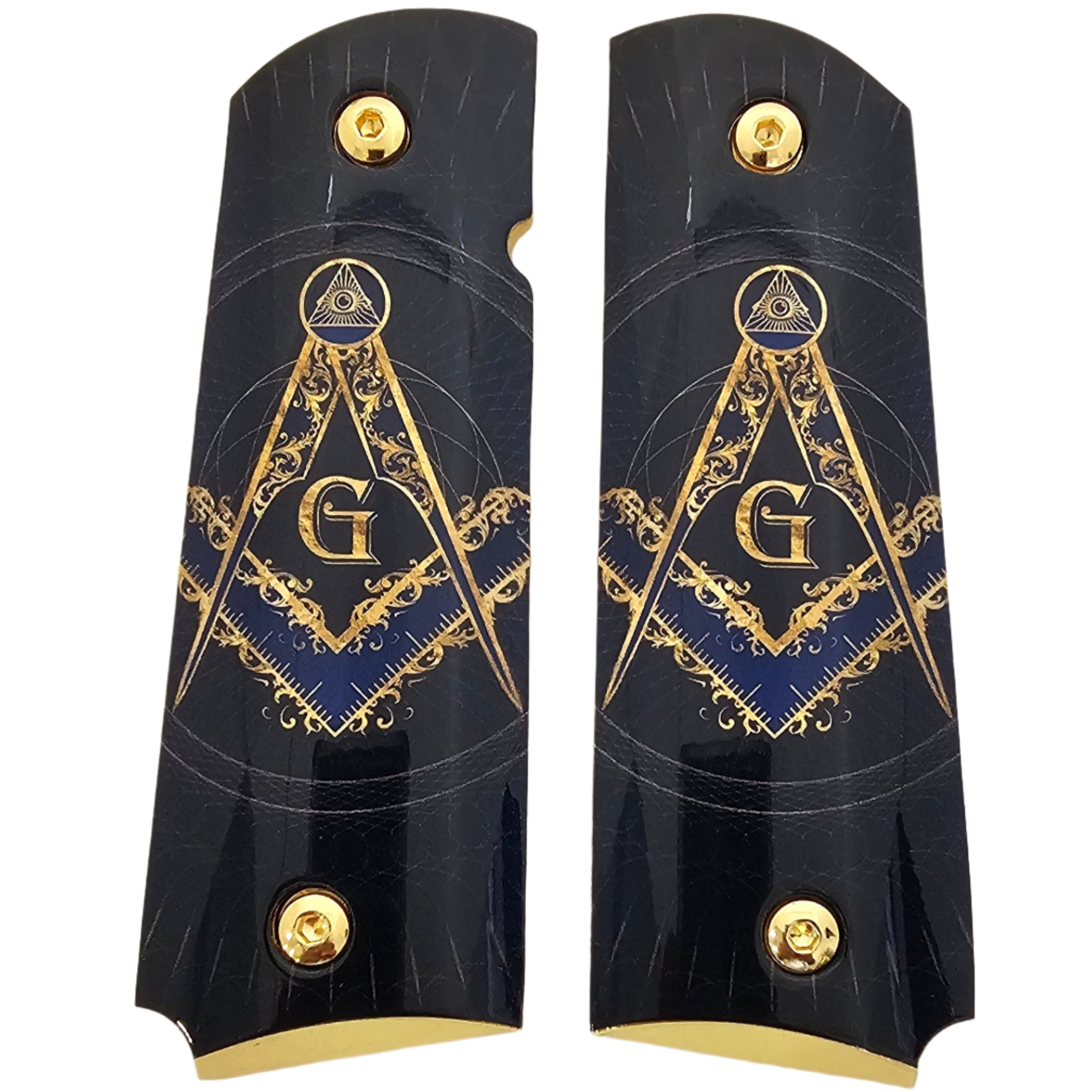 Celebrate tradition, craftsmanship, and symbolism with these premium 1911 full-size metal grips featuring the iconic Freemason Square and Compass design. The gold and blue detailing, centered with the classic “G” emblem and topped by the all-seeing eye, creates a bold statement against a deep polished black background.