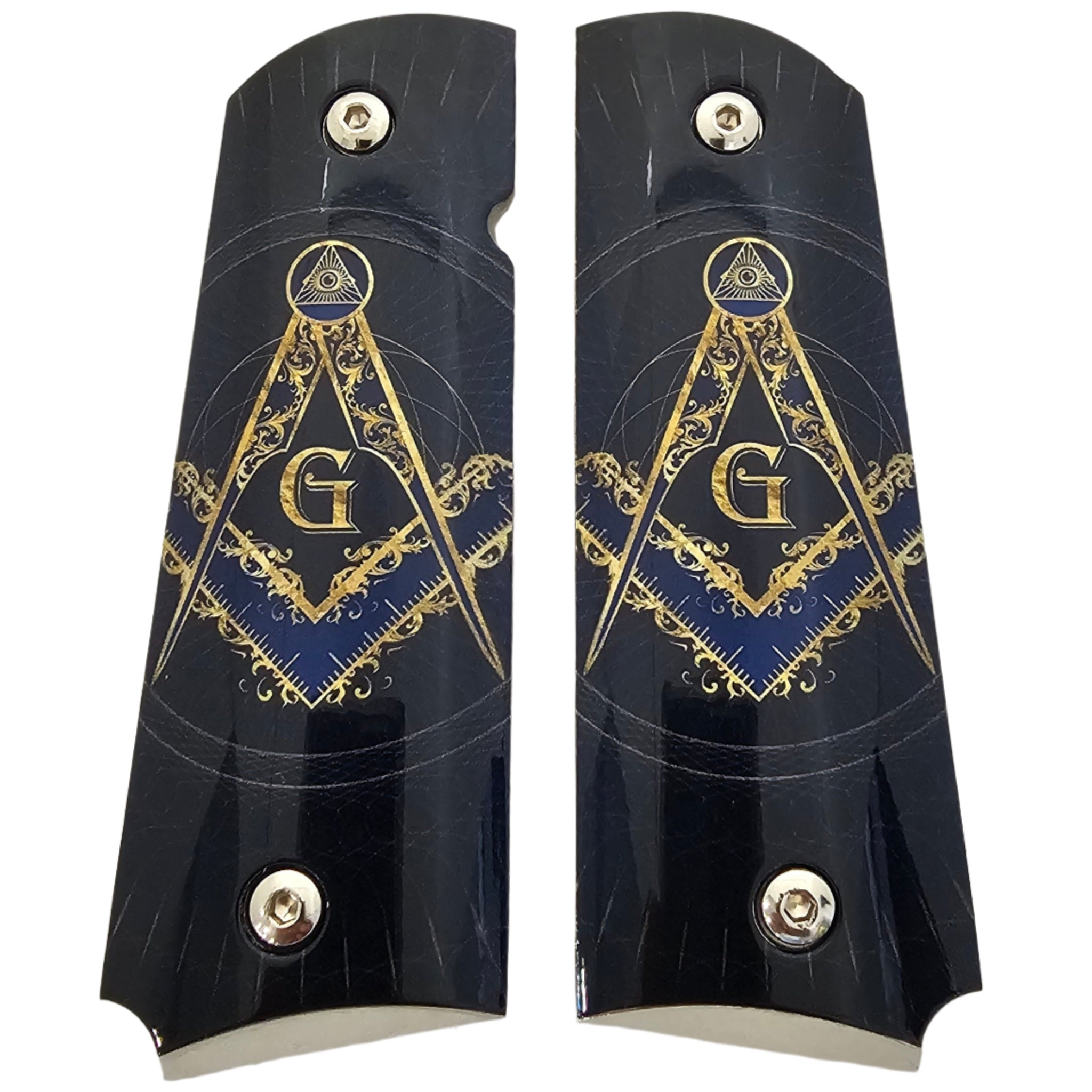 Celebrate tradition, craftsmanship, and symbolism with these premium 1911 full-size metal grips featuring the iconic Freemason Square and Compass design. The nickel and blue detailing, centered with the classic “G” emblem and topped by the all-seeing eye, creates a bold statement against a deep polished black background.