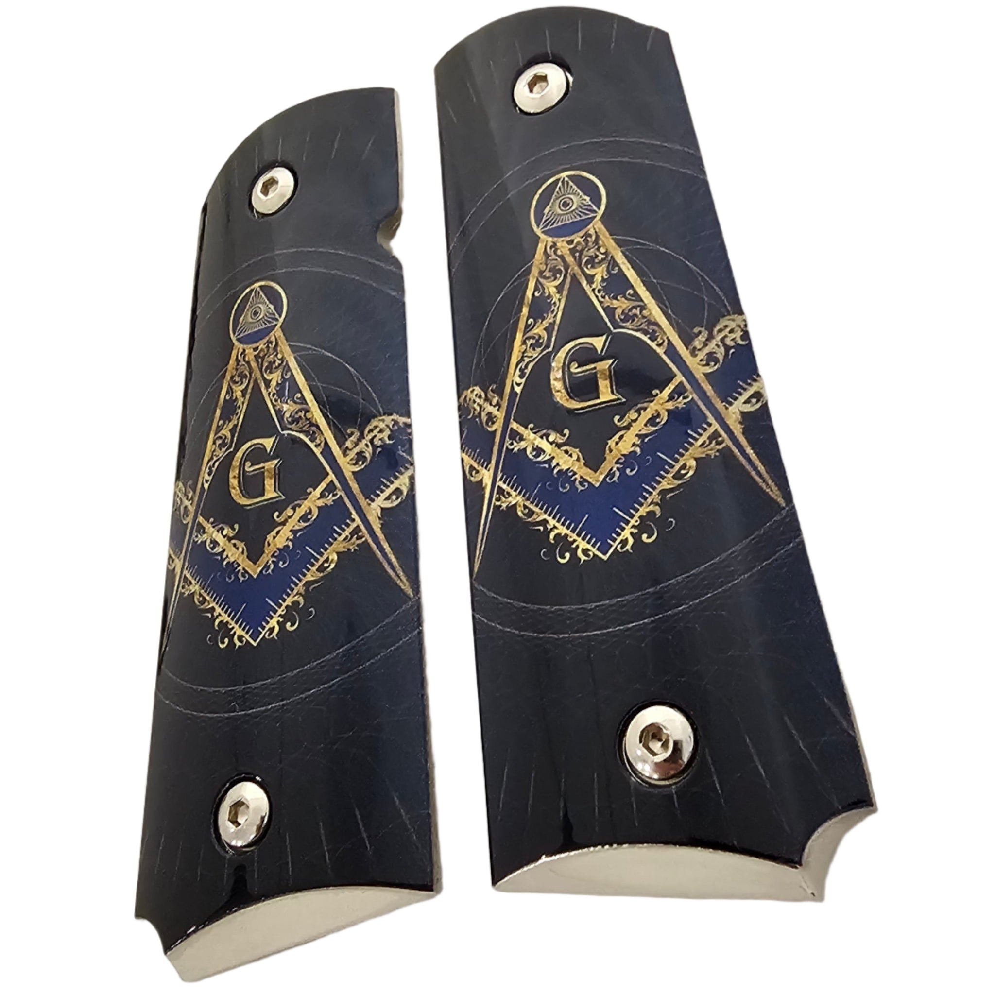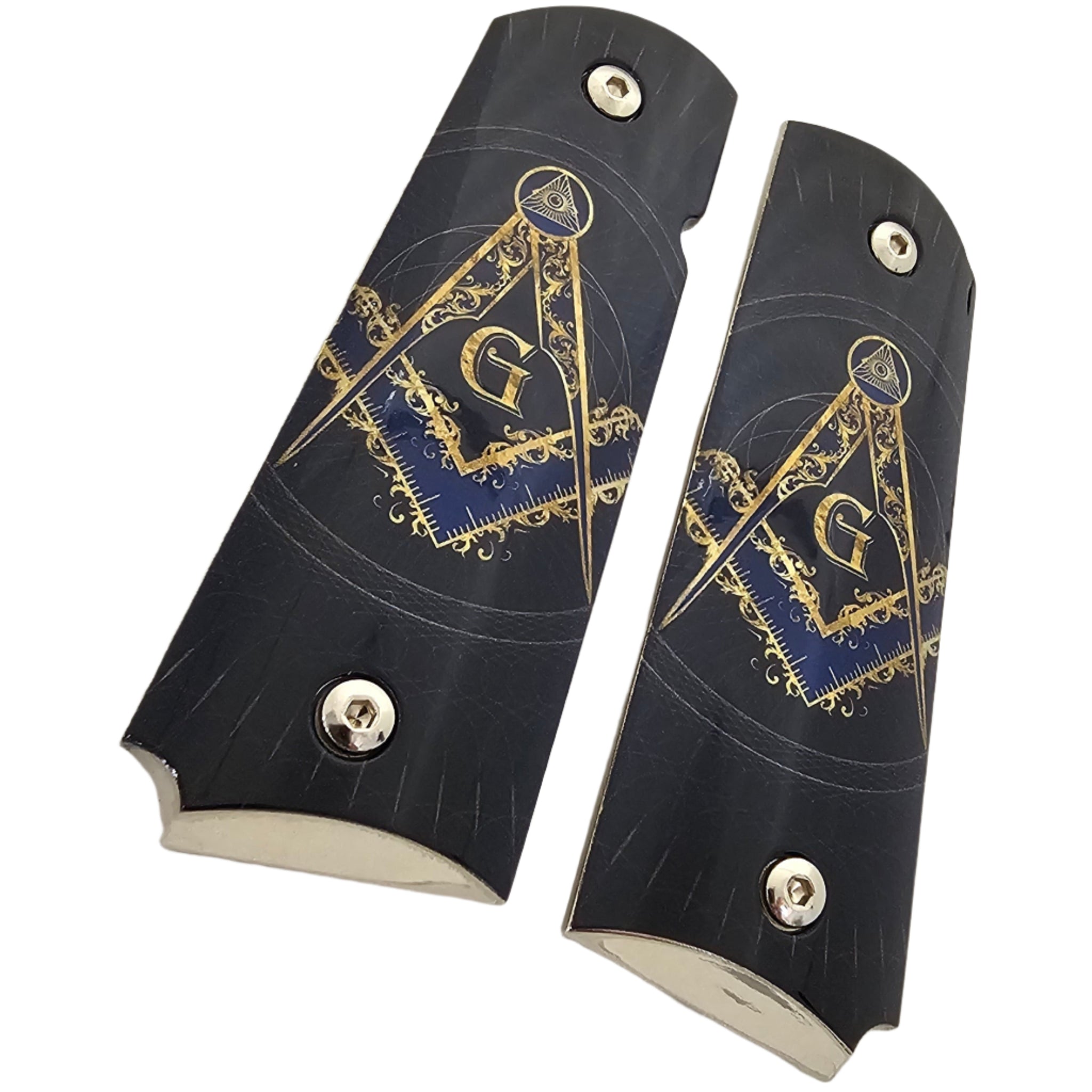 1911 Full Size Metal Grips – Masonic Freemason Square and Compass Design – Ambi Cut – Polished Black & Nickel