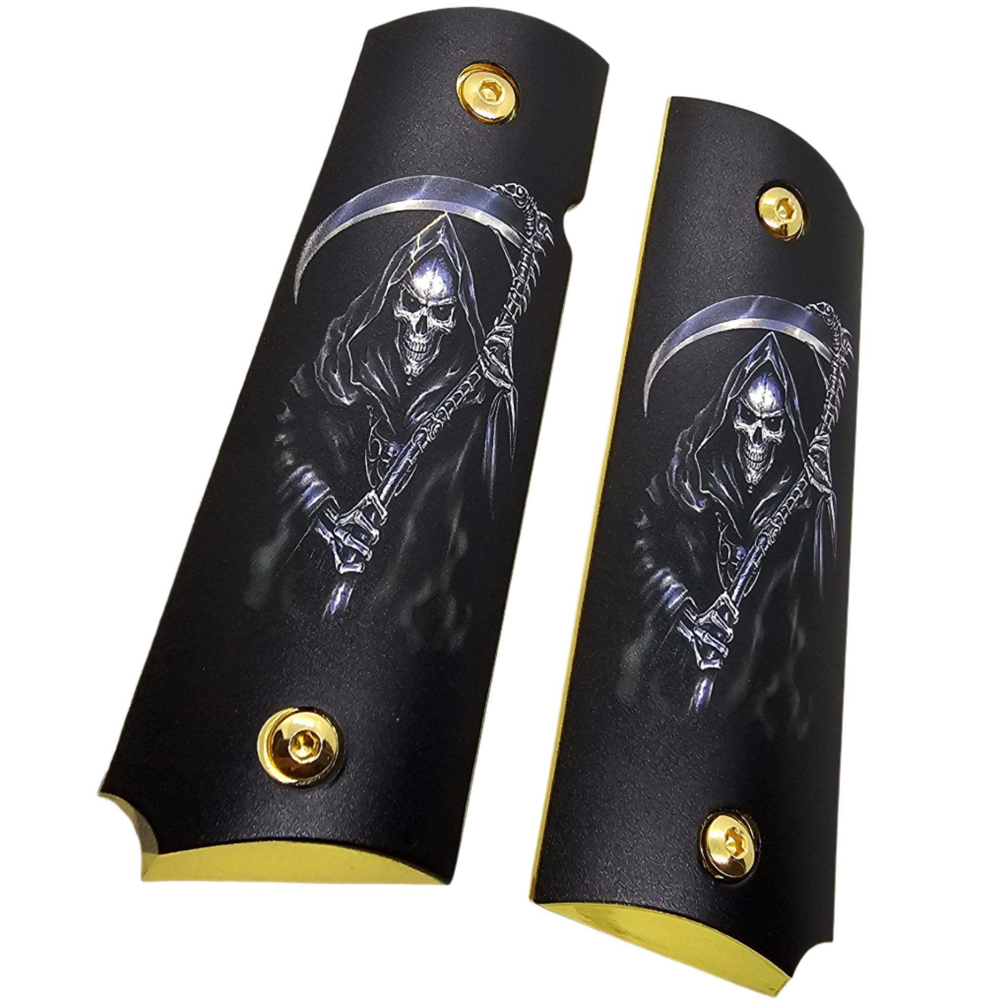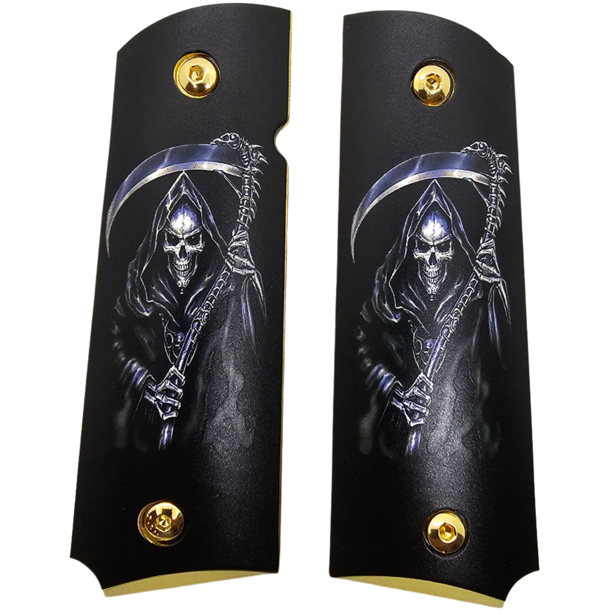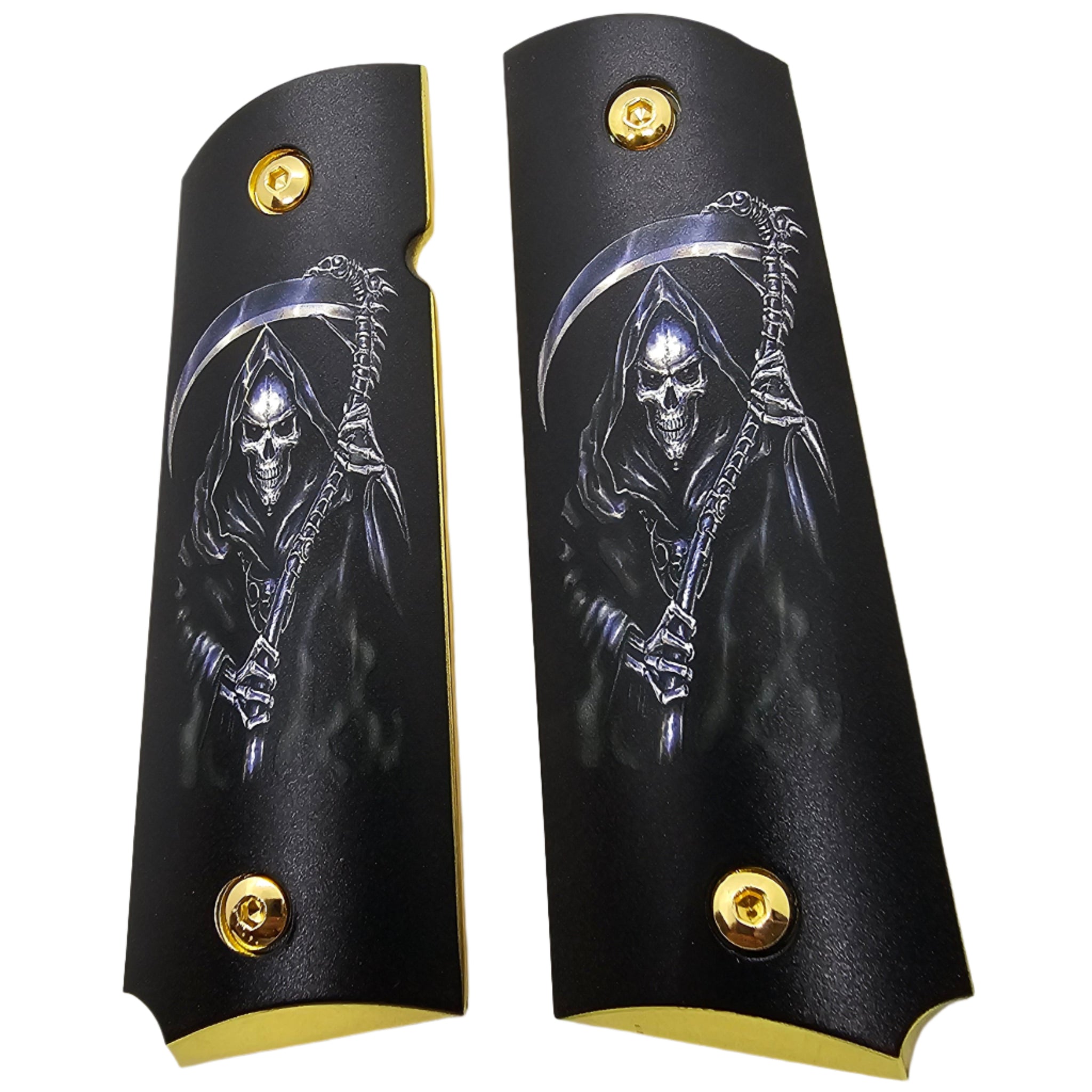 Add bold personality and an intimidating edge to your 1911 with these custom Grim Reaper full-size grips. Crafted for style and performance, these grips feature detailed artwork of the Reaper with a deadly scythe — a perfect match for any warrior’s sidearm.
