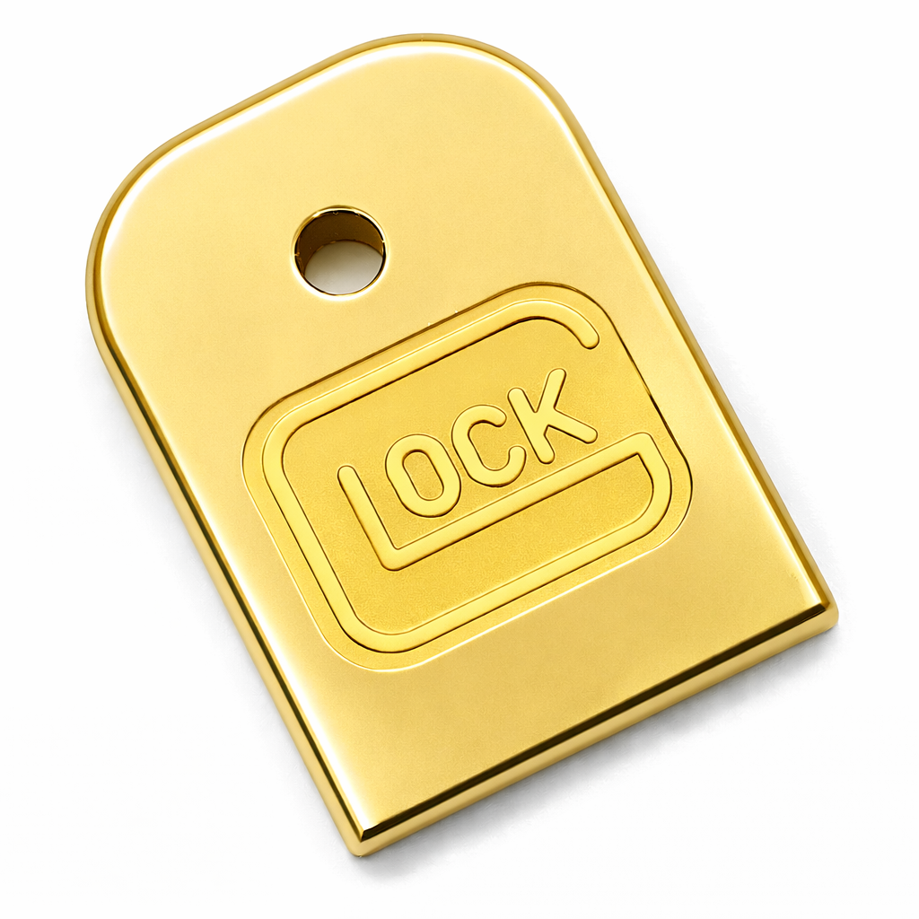 • Glock 17, 19, 22, 23, 26 (Gen 1–5) Metal Magazine Base Plates – 2 Pack | Gold Engraved Design
