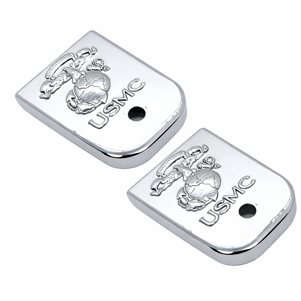 • Glock 17, 19, 22, 23, 26 (Gen 1–5) Metal Magazine Base Plates (2-Pack) USMC Chrome