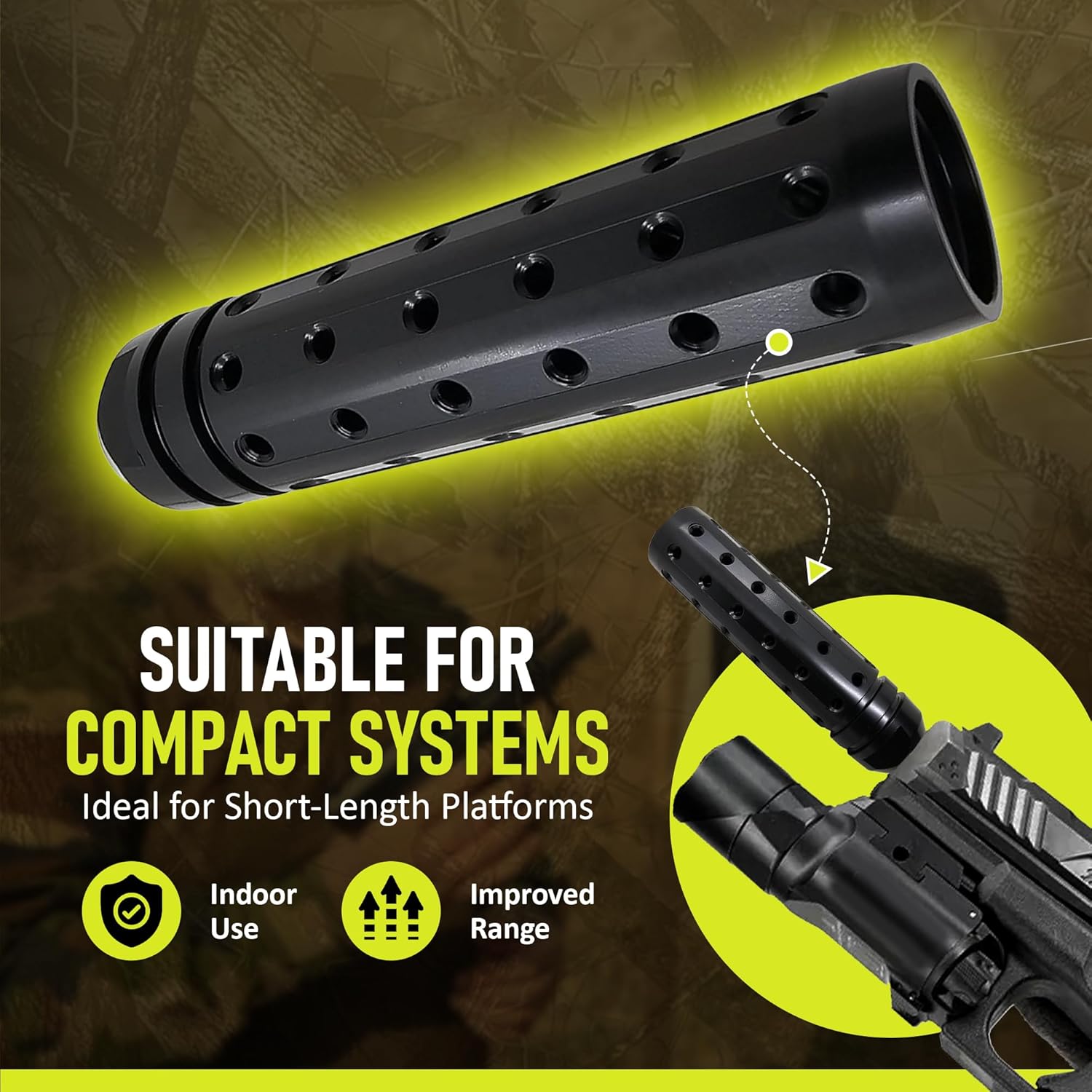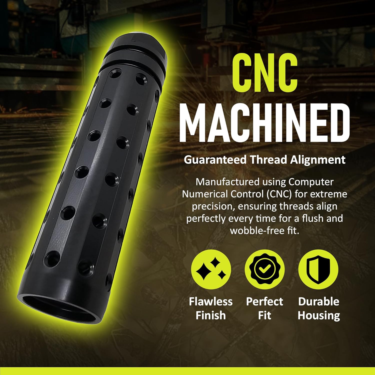 Upgrade your build with this precision-machined linear muzzle brake, designed for balance, thread coverage, and visual symmetry. Made from aircraft-grade CNC aluminum and finished in matte black anodizing, this 4-inch brake delivers a sleek, tactical appearance while maintaining durability and precision alignment.