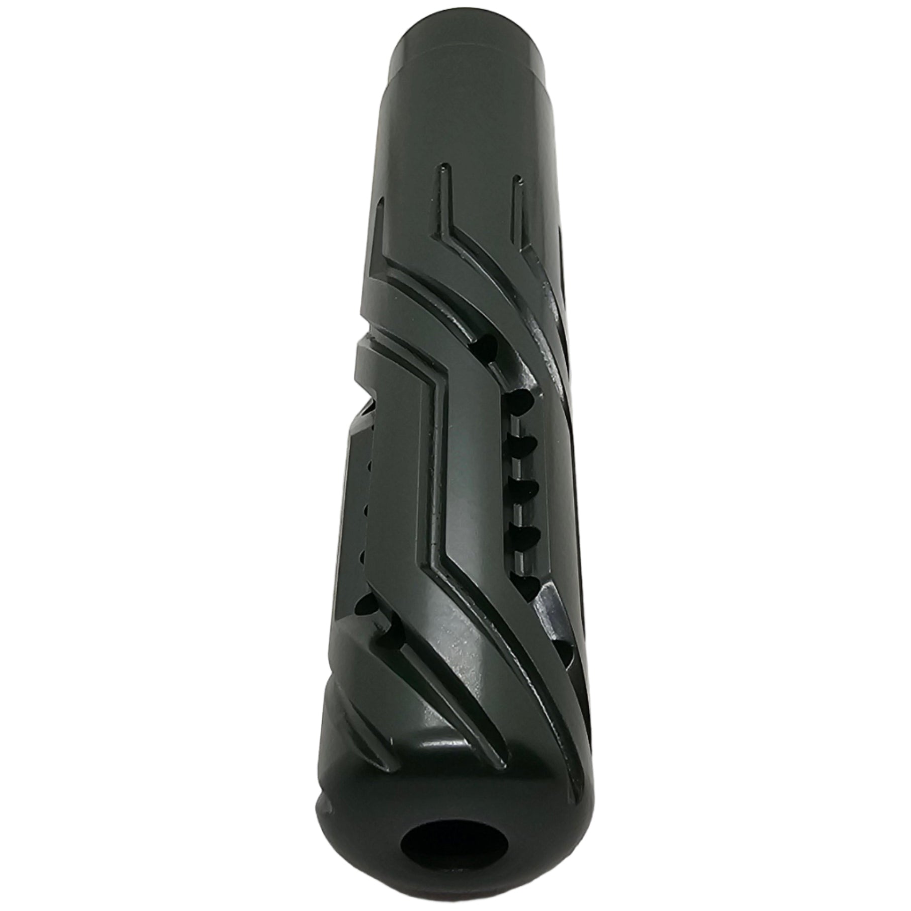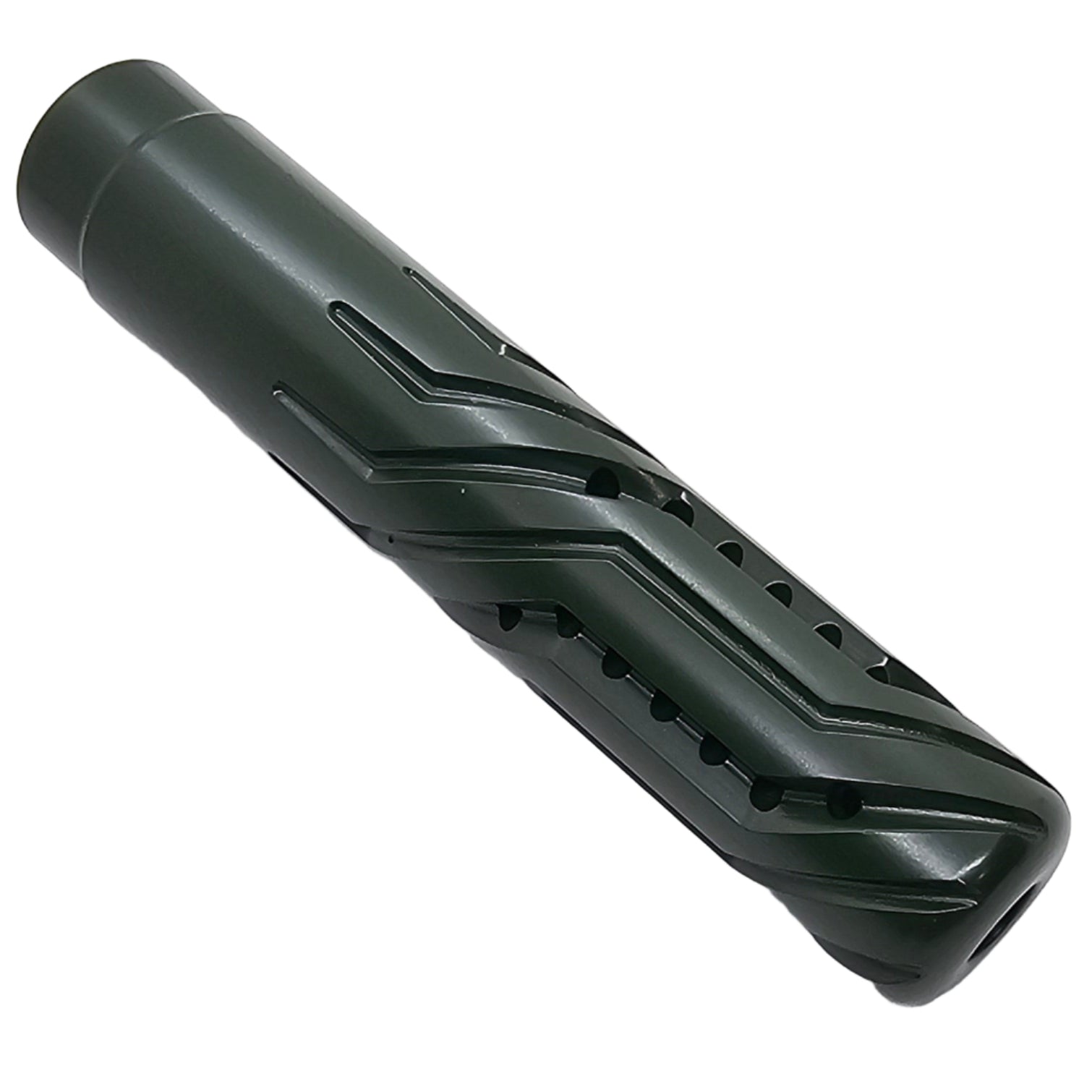 CNC-machined 5" Helix FP muzzle brake in 7075 aluminum with 28 deep-cut ports for maximum gas displacement and reduced recoil. 5/8-24 thread (.300/.308/7.62).