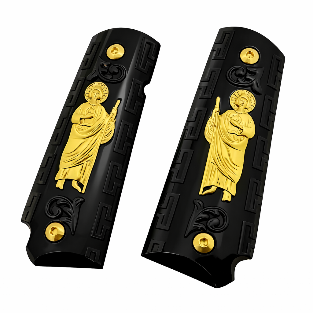 Upgrade your 1911 with a bold Black & Gold St. Jude grip set designed for full-size Government-pattern pistols and compatible clones.