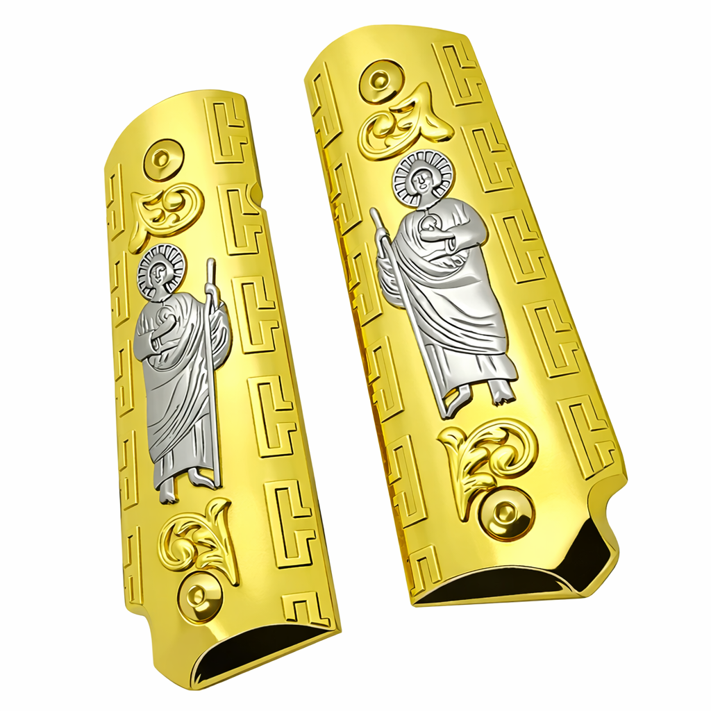 Upgrade your 1911 with a bold Gold & Nickel St. Jude grip set designed for full-size Government-pattern pistols and compatible clones.