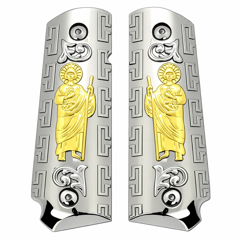 Upgrade your 1911 with a bold Nickel / Gold St. Jude grip set designed for full-size Government-pattern pistols and compatible clones.