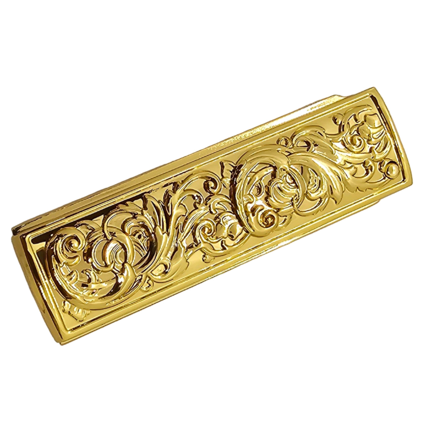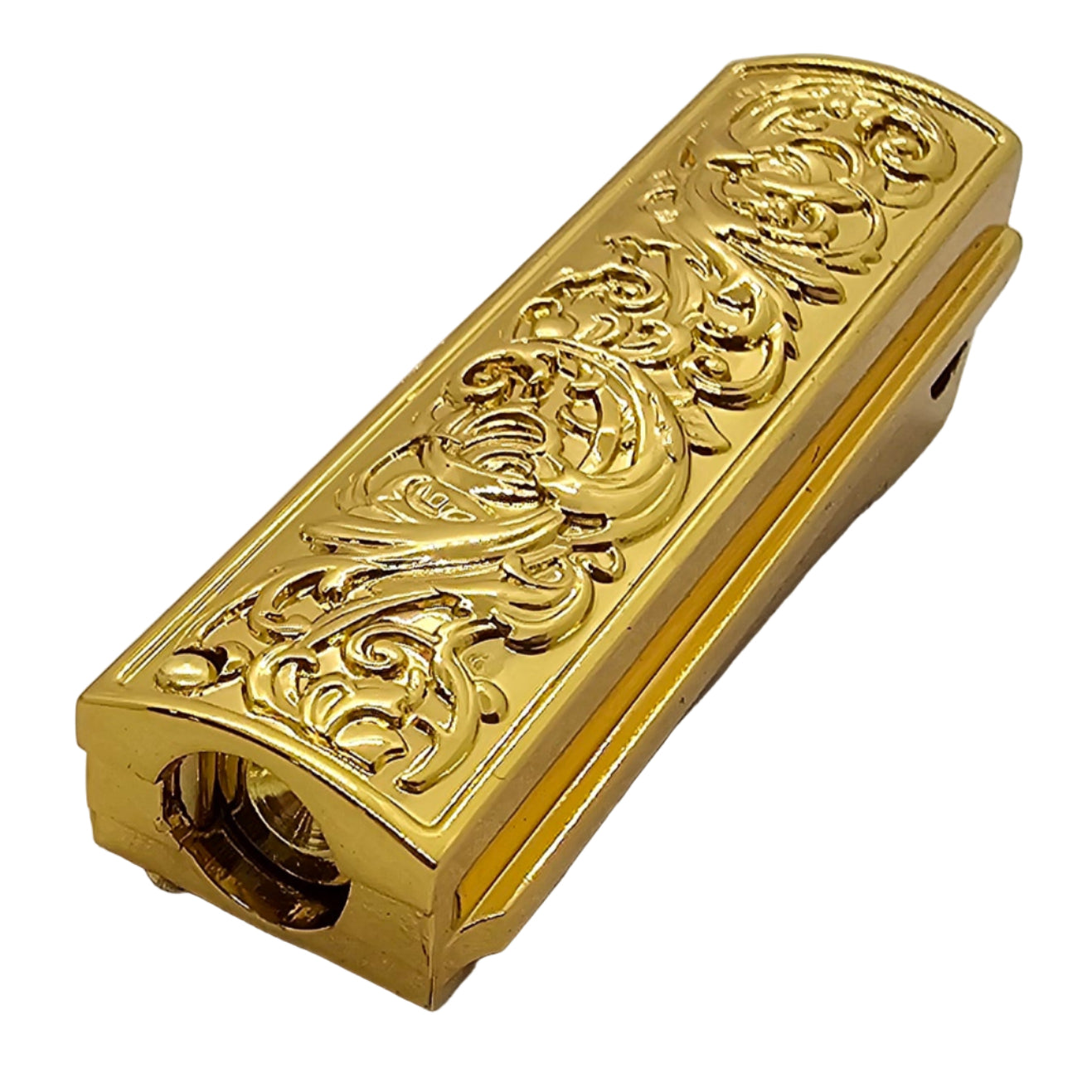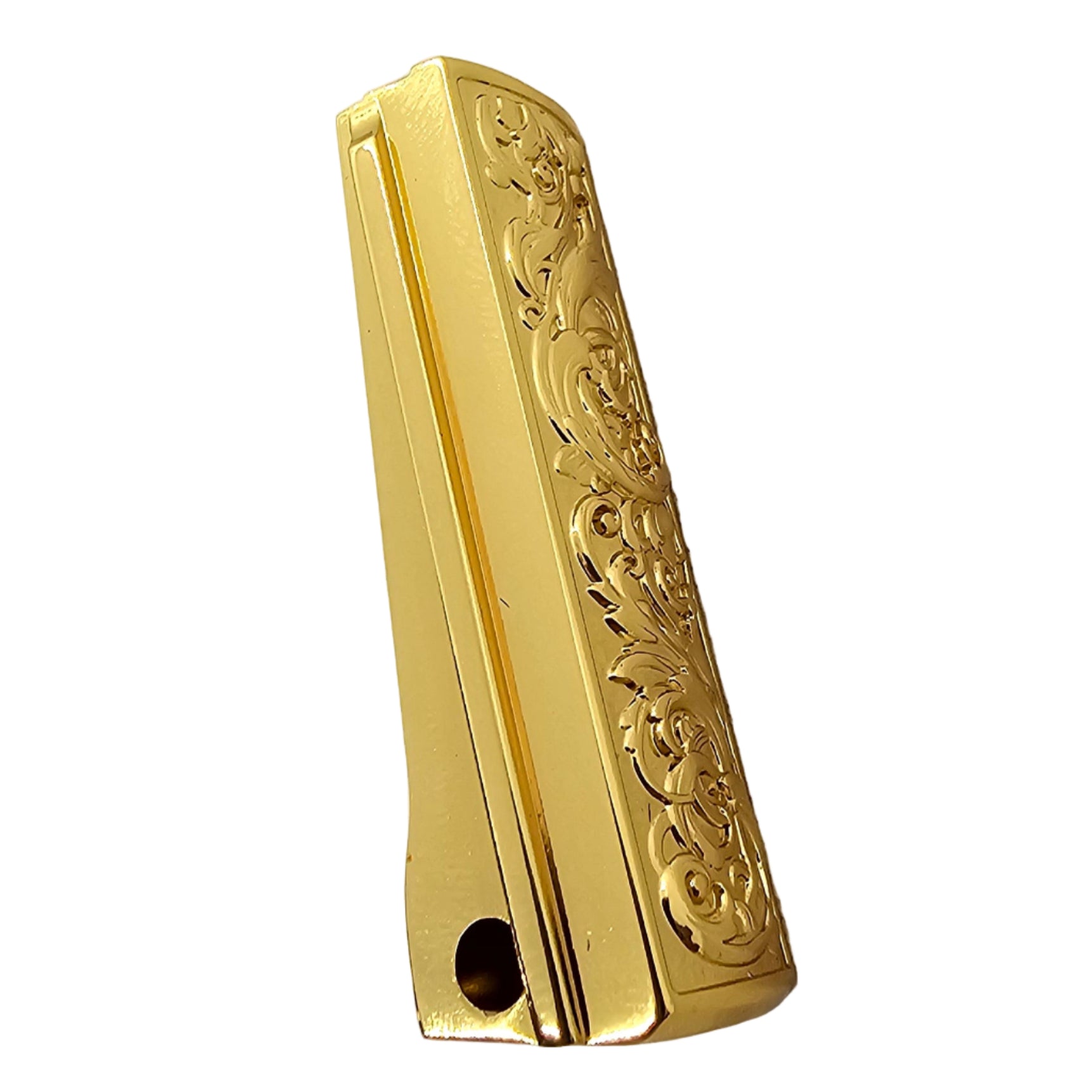 Add a premium touch to your 1911 with this engraved full-size mainspring housing, crafted from solid steel and finished with a polished gold plating. Featuring intricate scroll engraving, this upgrade combines durability with high-end design for a unique custom look.