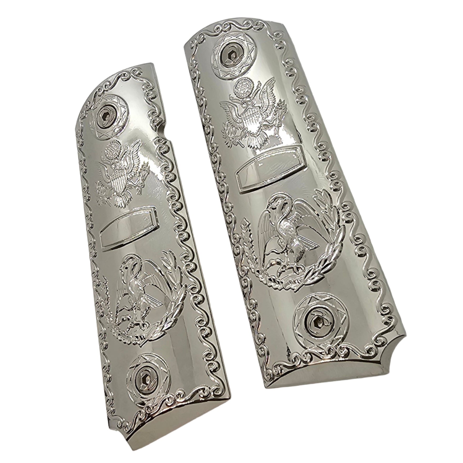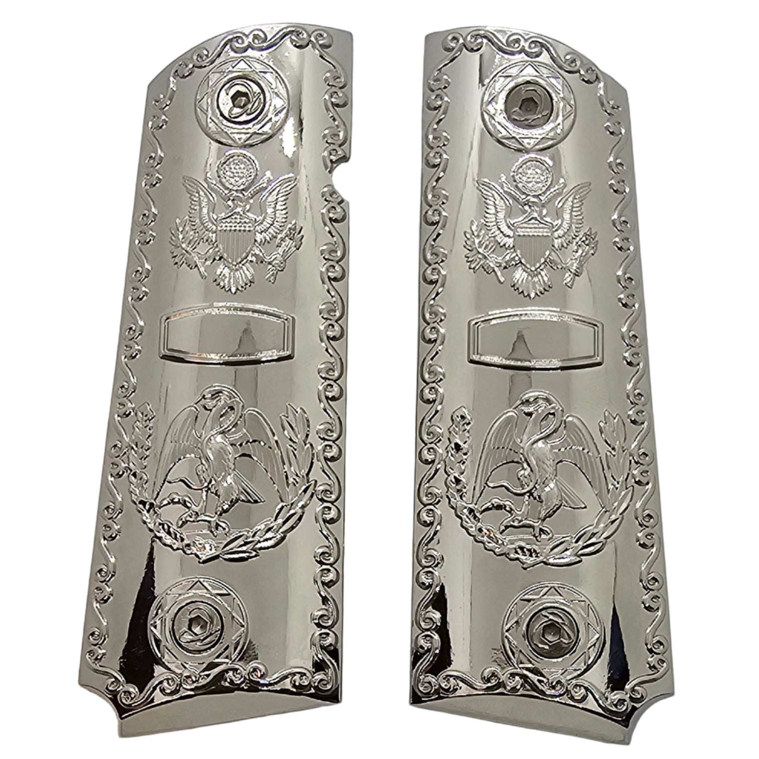 Give your 1911 a clean, patriotic look with these full-size metal grip panels. Each side features an intricately detailed eagle and crest surrounded by ornamental scrollwork, all set in a mirror-like chrome-plated finish.