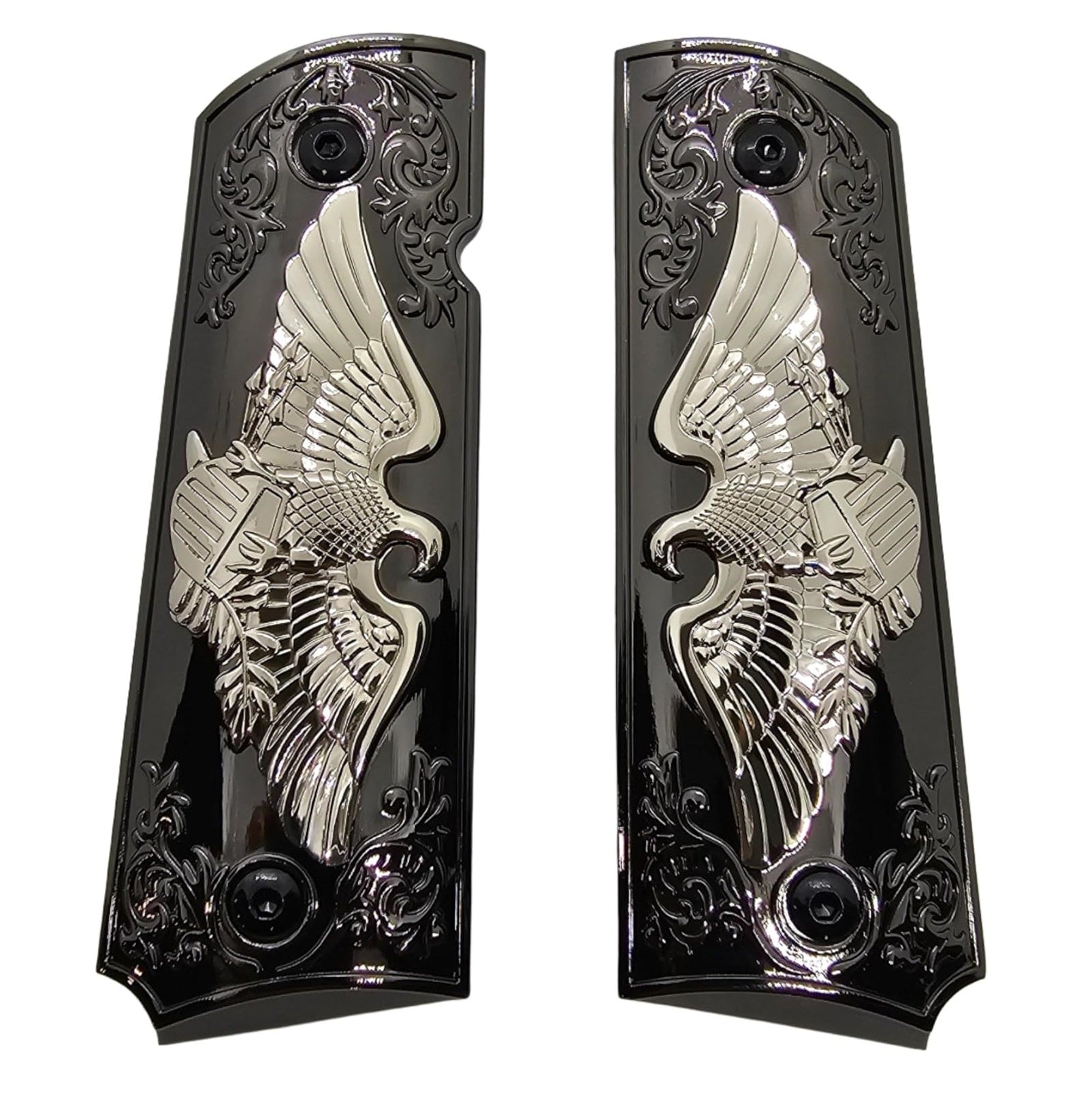 Give your 1911 a commanding and sophisticated look with these Black & Silver Eagle Metal Grips. Featuring a raised silver eagle soaring across a deep black polished base with ornate floral engraving, this design blends strength and elegance. The high-gloss finish enhances the visual depth, while the durable cast metal alloy ensures a perfect balance of beauty and resilience.