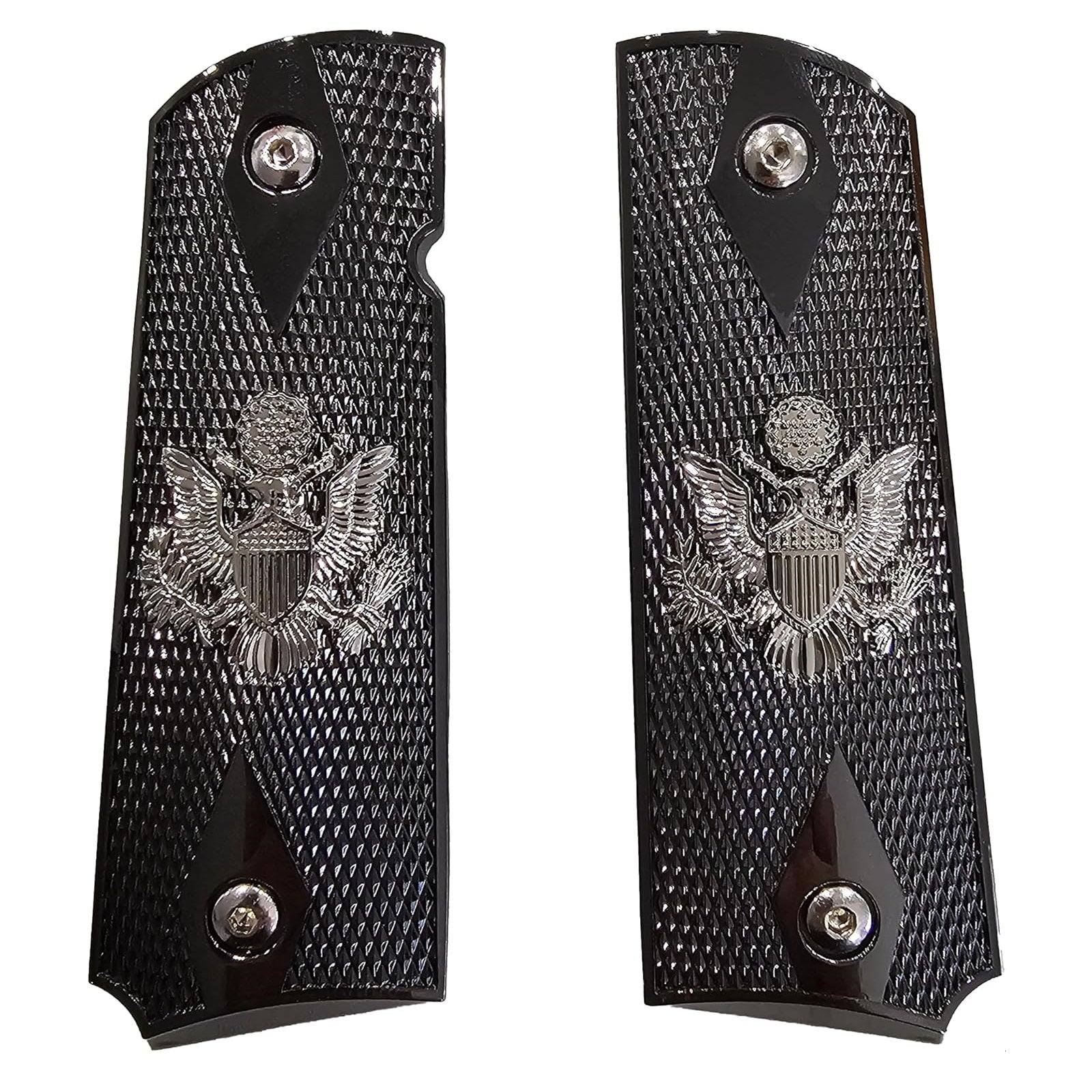 Elevate your 1911’s look with these Black & Silver Great Seal Metal Grips, designed to represent strength, honor, and American pride. The detailed Great Seal of the United States is elegantly raised over a deep black textured surface, accented with a polished silver finish for a bold, modern aesthetic. Built from durable cast metal alloy, these grips ensure a secure hold and a perfect fit for both display and range use.