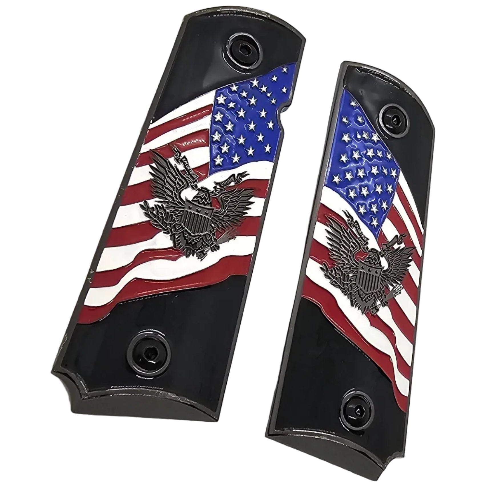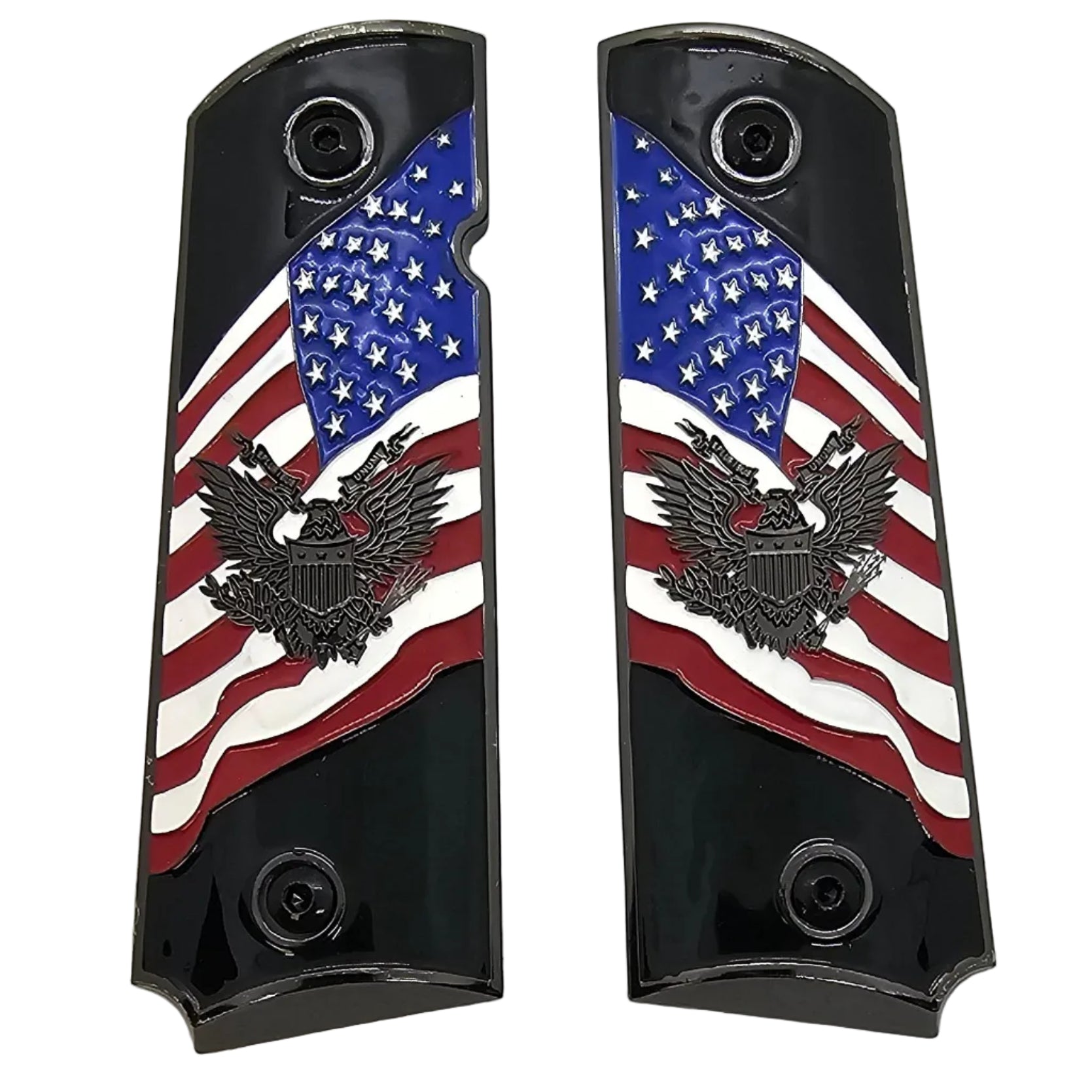 1911 Full-Size Metal Grips Black – USA Flag + Eagle Emblem Enamel (Ambi Cut) + Screws