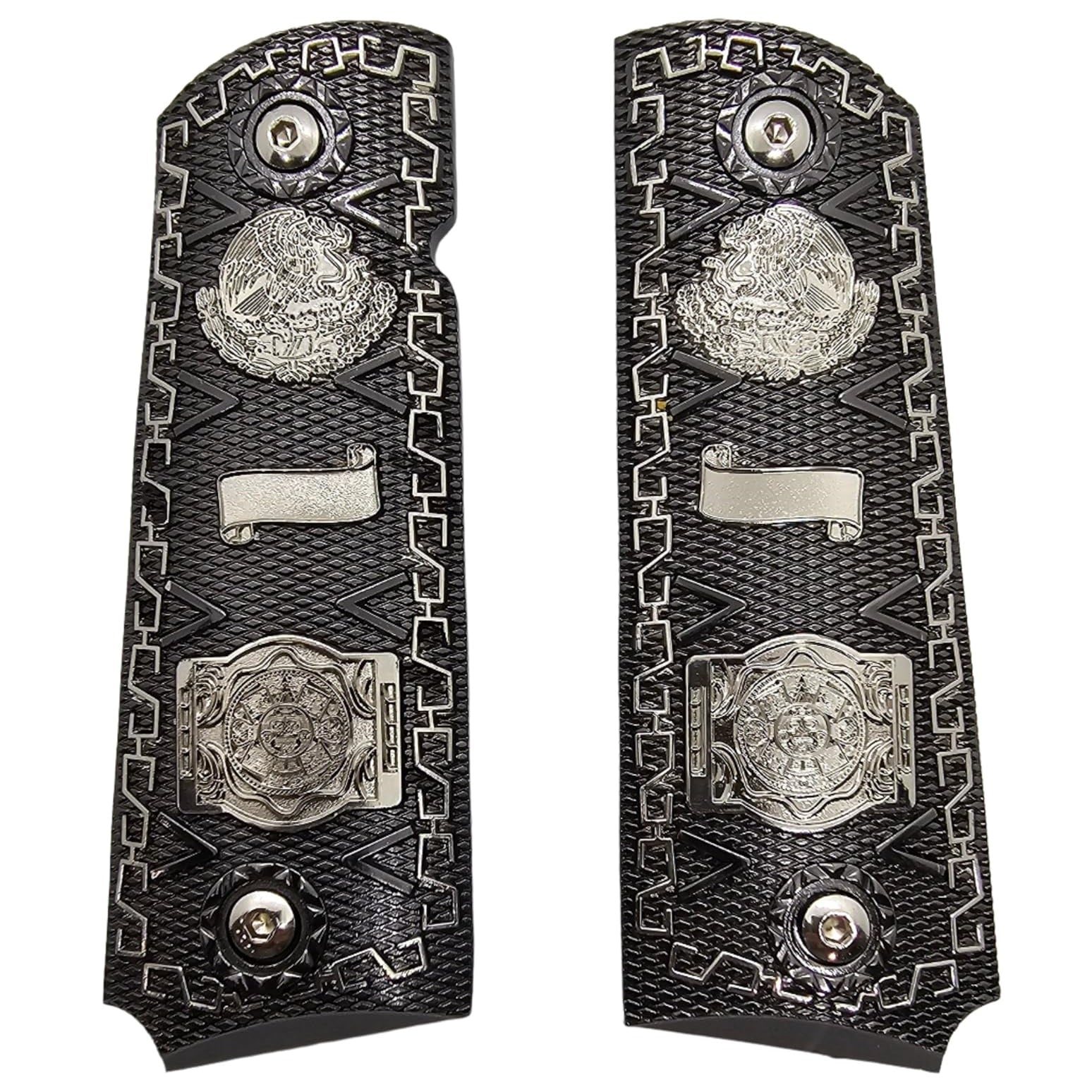 • 1911 Full Size Metal Grips – Black with Silver Mexican Eagle & Aztec Calendar Design (Ambi Cut, Includes 4 Screws)