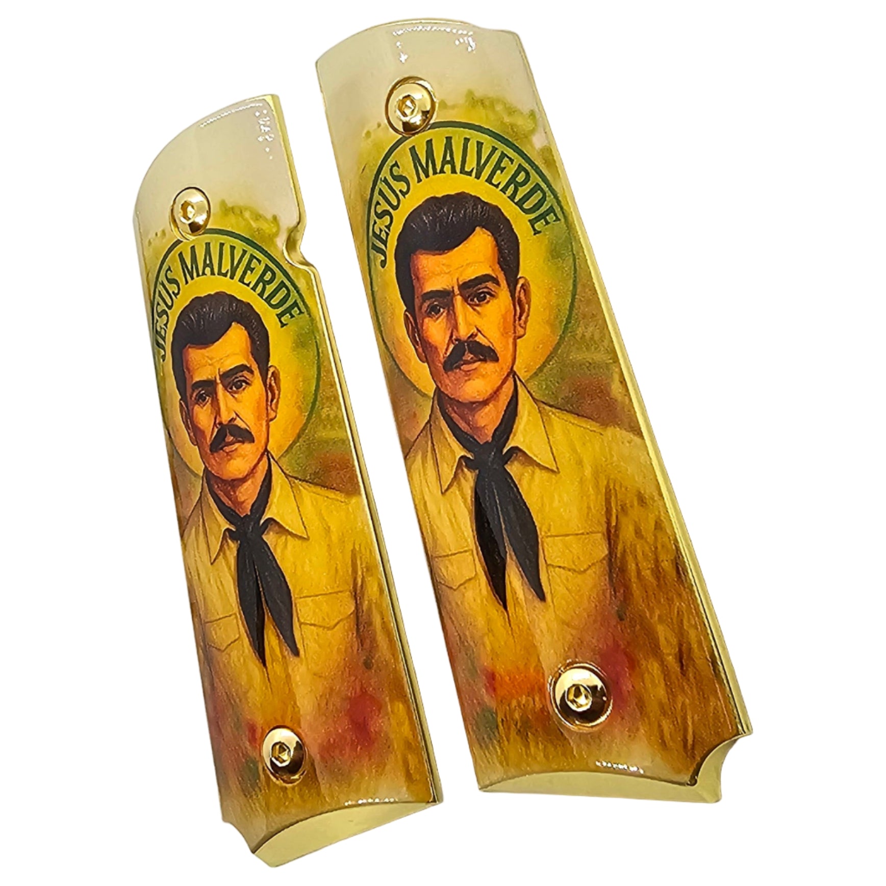 1911 Full Size Metal Grips – Jesús Malverde Cultural Design with Ambi Cut & Screws, Gold Plated Base
