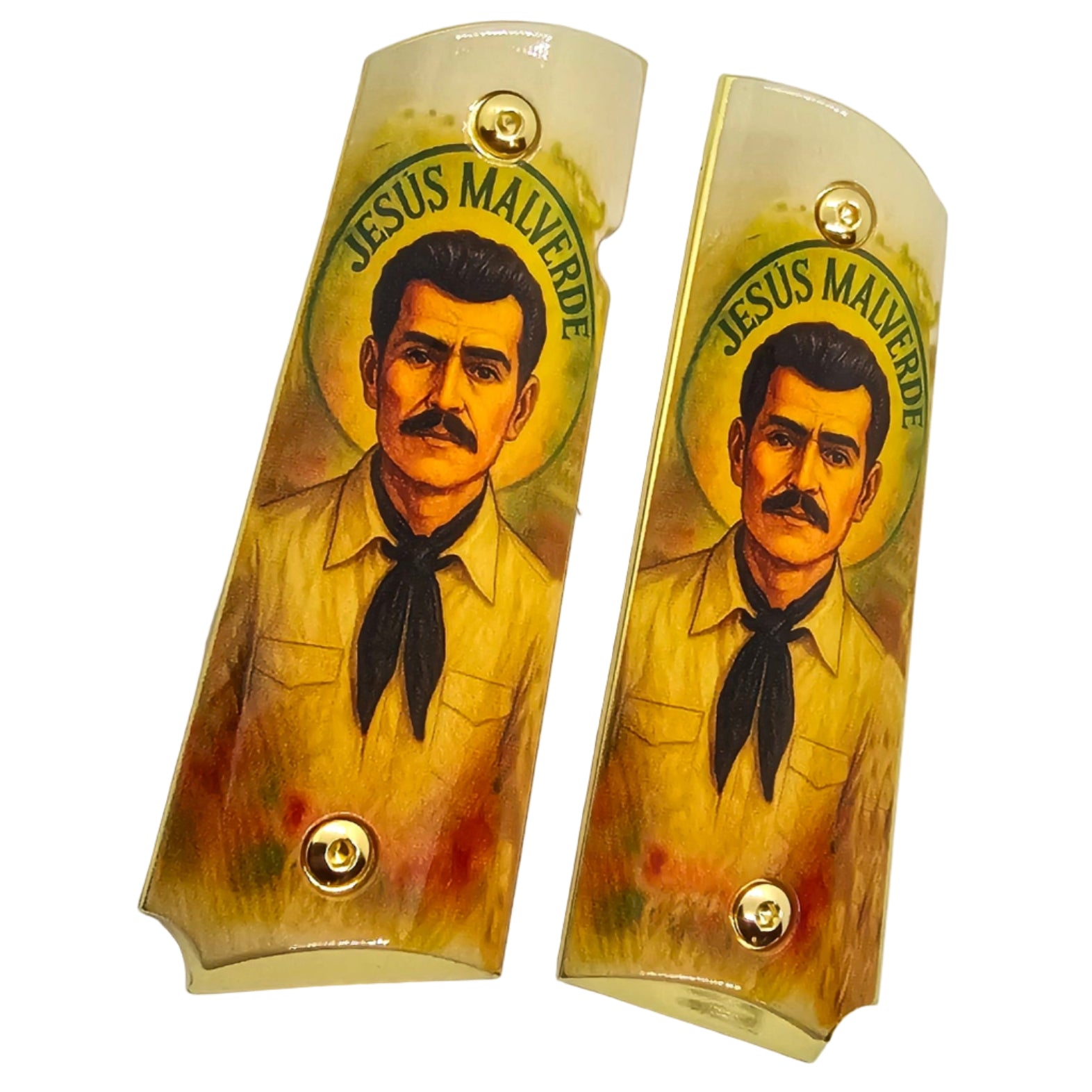• 1911 Full Size Metal Grips – Jesús Malverde Cultural Design with Ambi Cut & Screws, Gold Plated Base