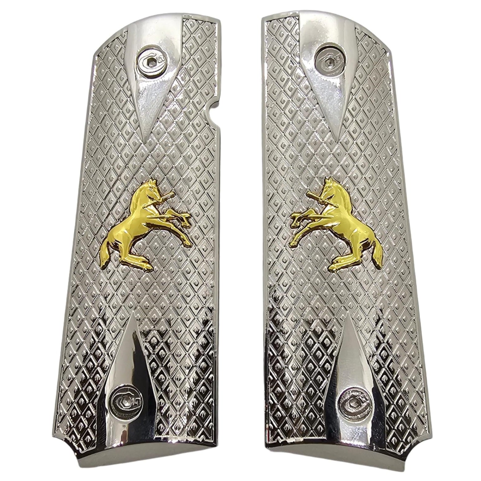 Upgrade your 1911 with these Chrome Diamond Pattern Metal Grips featuring a Gold Horse Emblem. Precision-crafted from cast metal alloy, these grips offer both elegance and strength. The diamond-textured chrome surface ensures a secure hold, while the polished gold horse centerpiece adds a bold, dynamic accent. Perfect for collectors and enthusiasts looking to personalize their firearm with luxury detail.