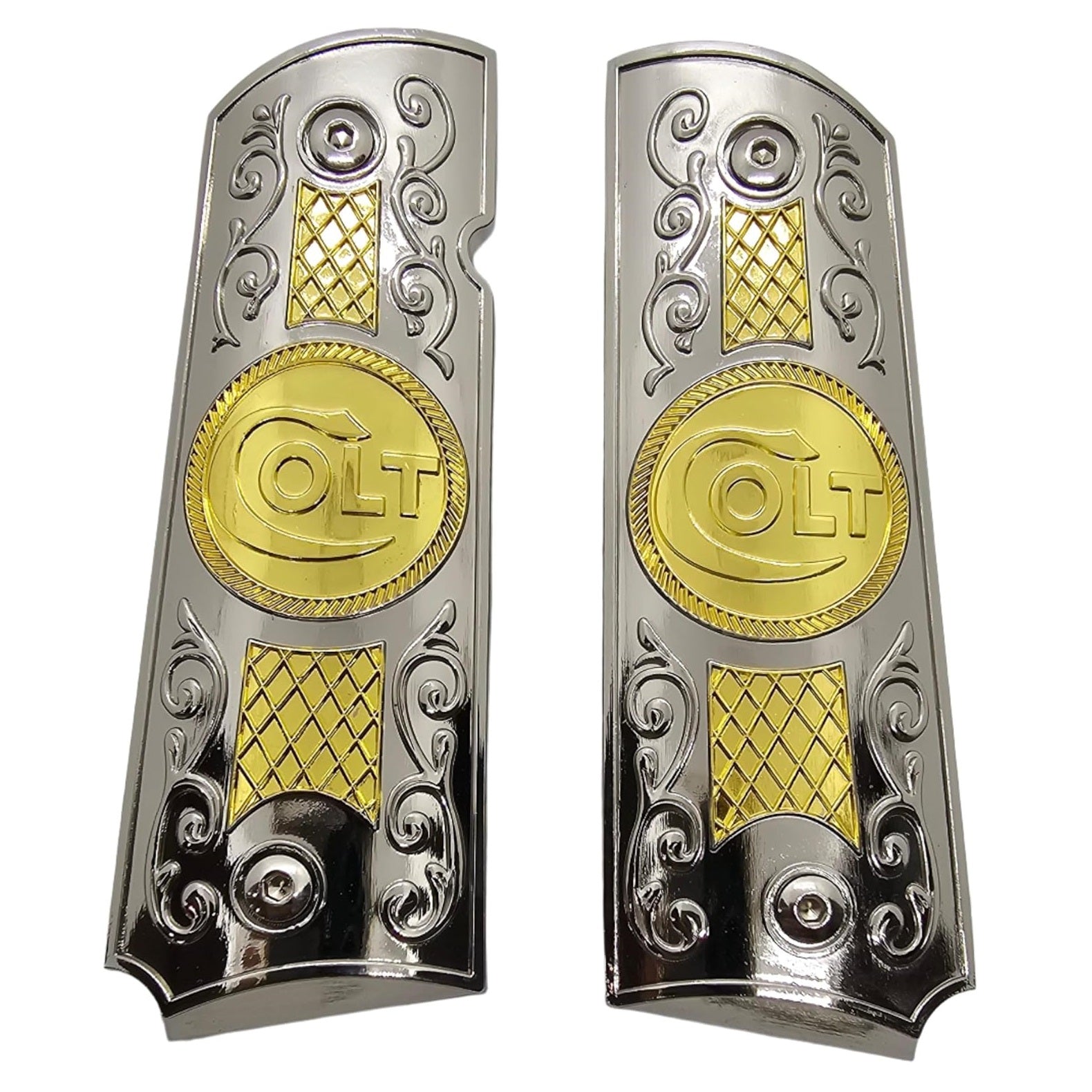 Upgrade your 1911 with these Chrome & Gold Colt Metal Grips, precision CNC-machined for a flawless fit and stunning appearance. Featuring detailed scrollwork, diamond texture panels, and a bold gold Colt medallion centerpiece, these grips combine craftsmanship and performance. The mirror-polished chrome base with gold highlights gives your pistol a premium, collectible look while maintaining a firm and comfortable grip.