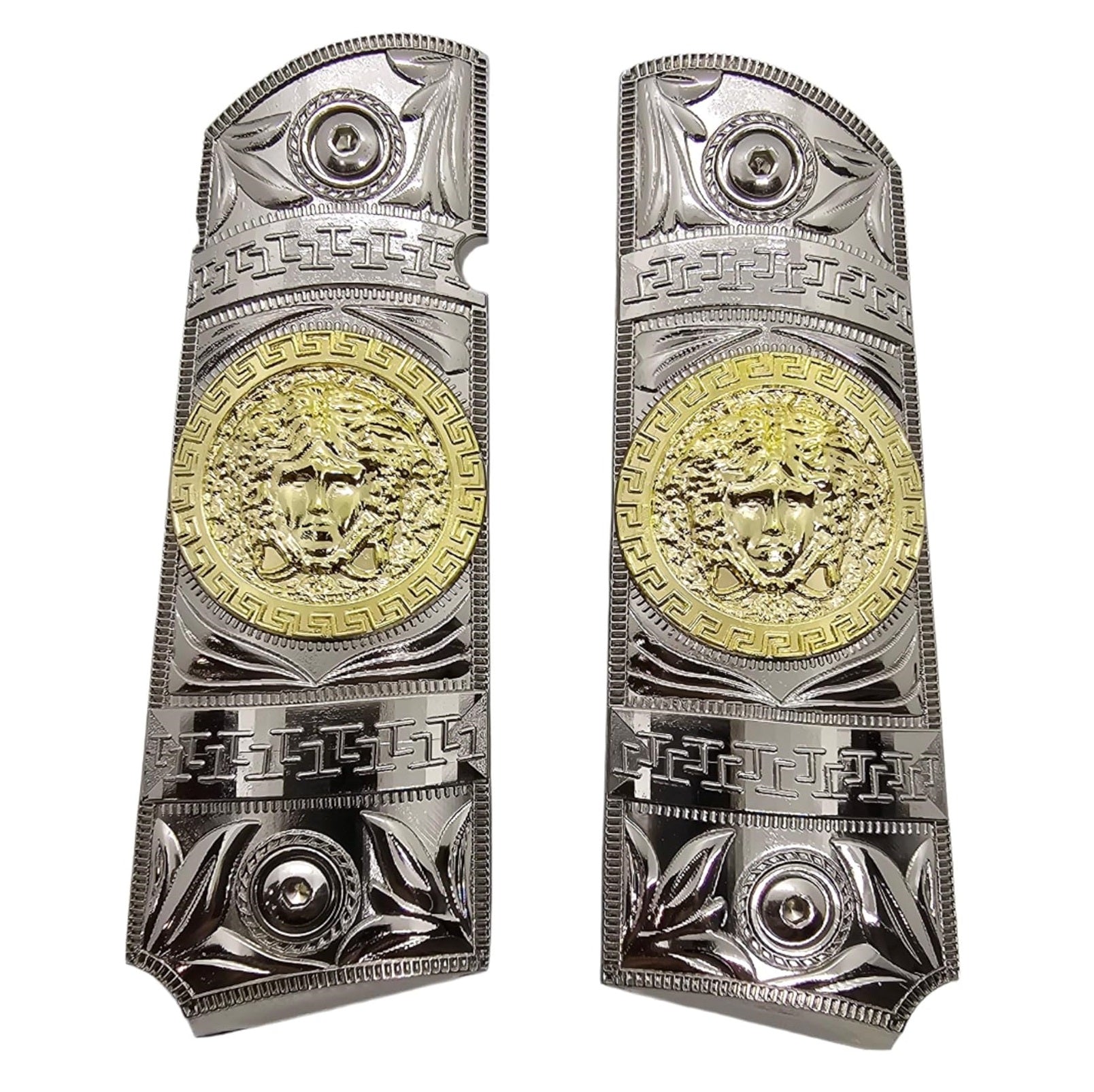 Give your 1911 a bold and artistic upgrade with these Chrome & Gold Medusa Metal Grips. Made from durable cast metal alloy, these grips feature a highly detailed Medusa centerpiece surrounded by intricate Greek key and laurel engravings. The brilliant chrome base and gold accents create a luxurious two-tone contrast that’s sure to stand out on any full-size 1911.