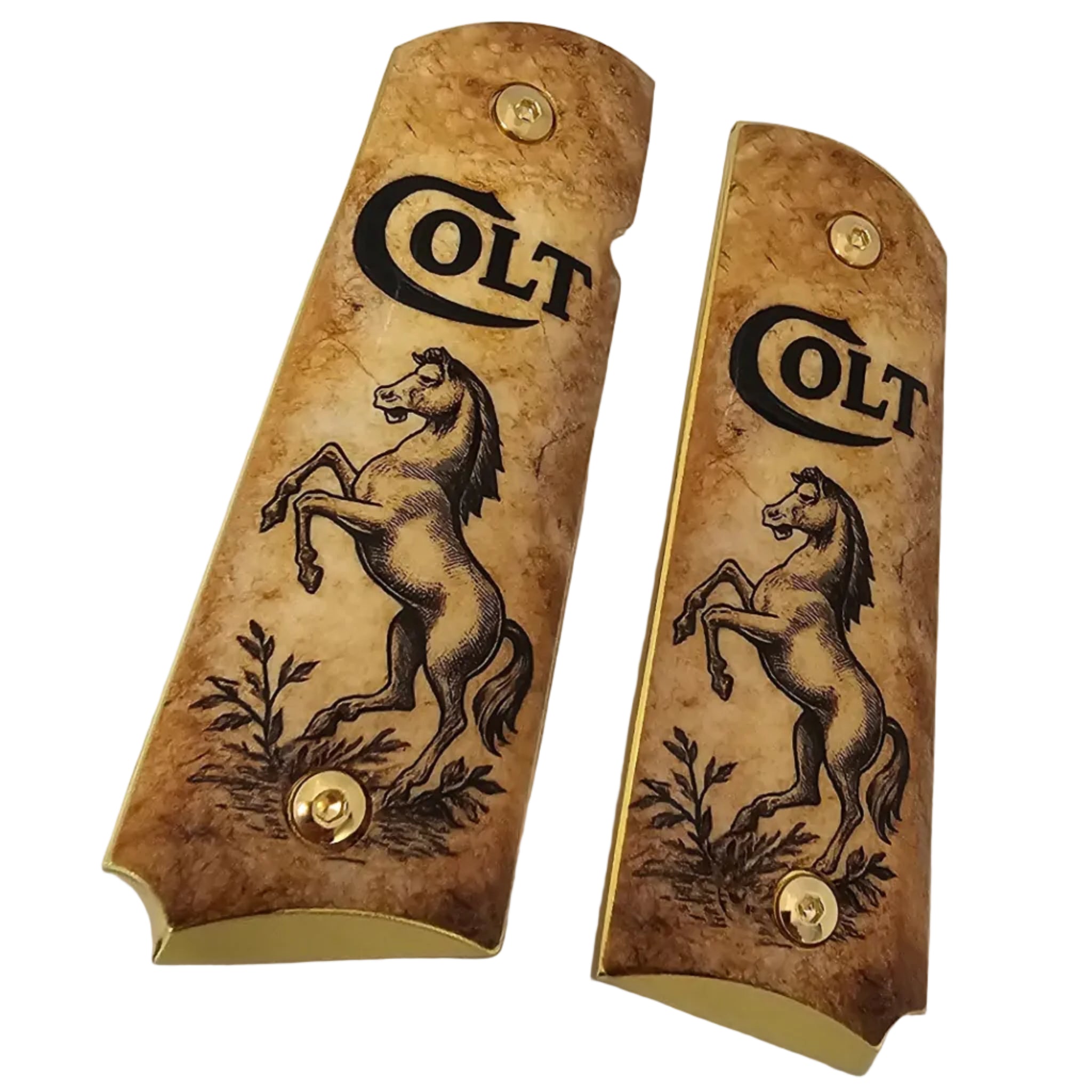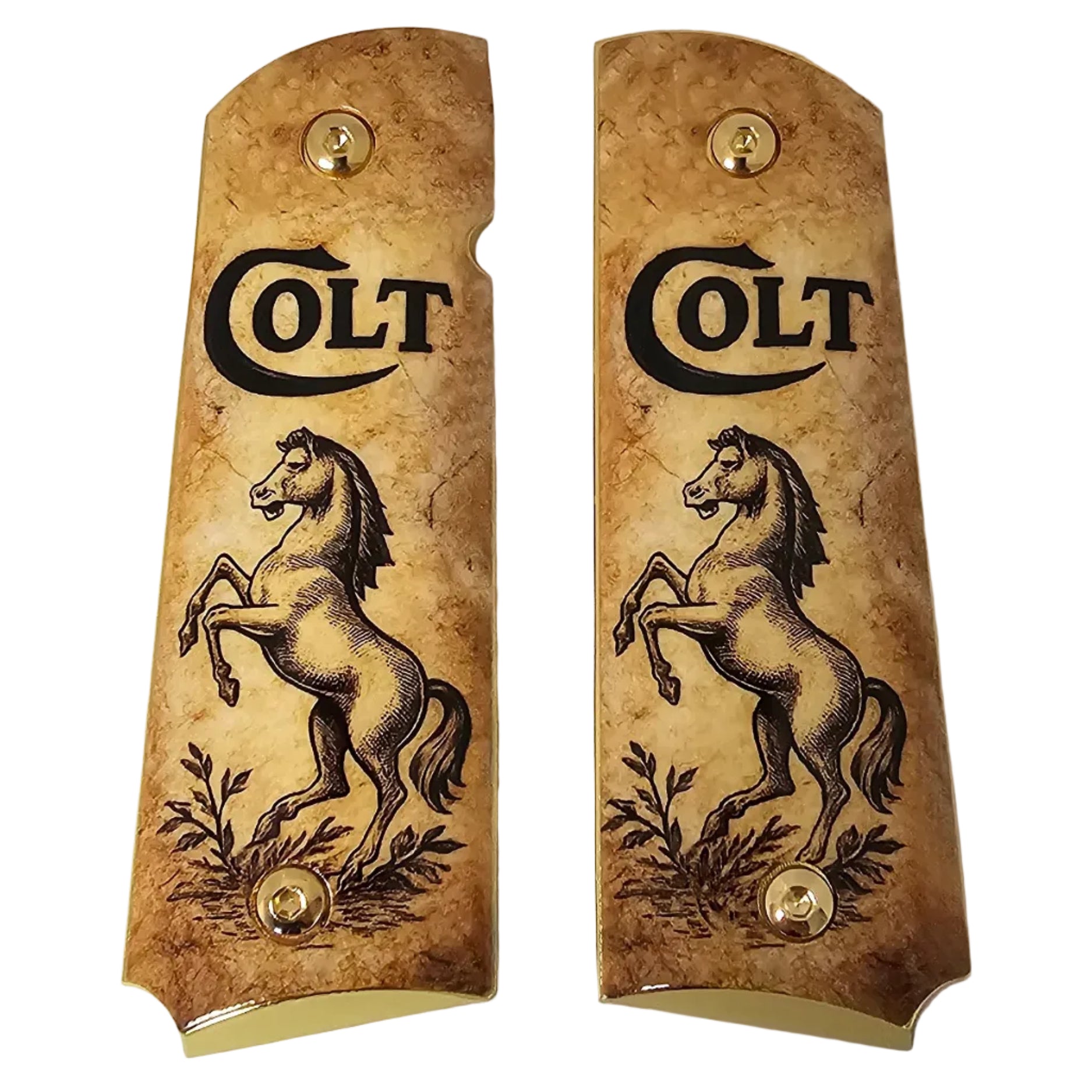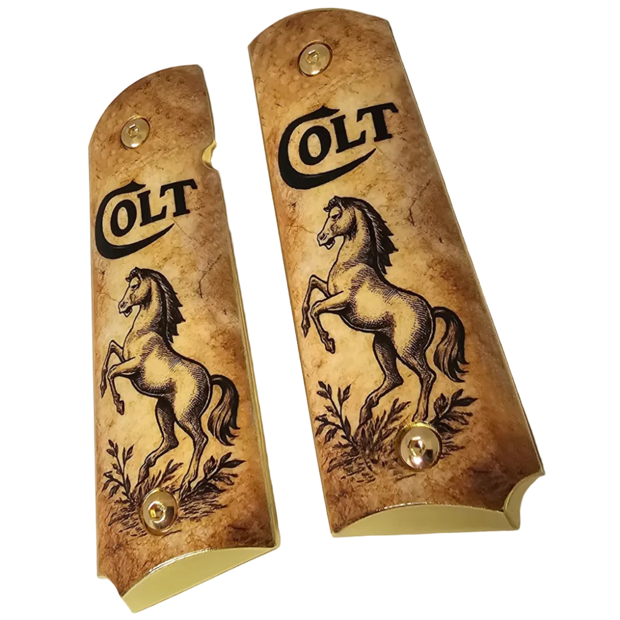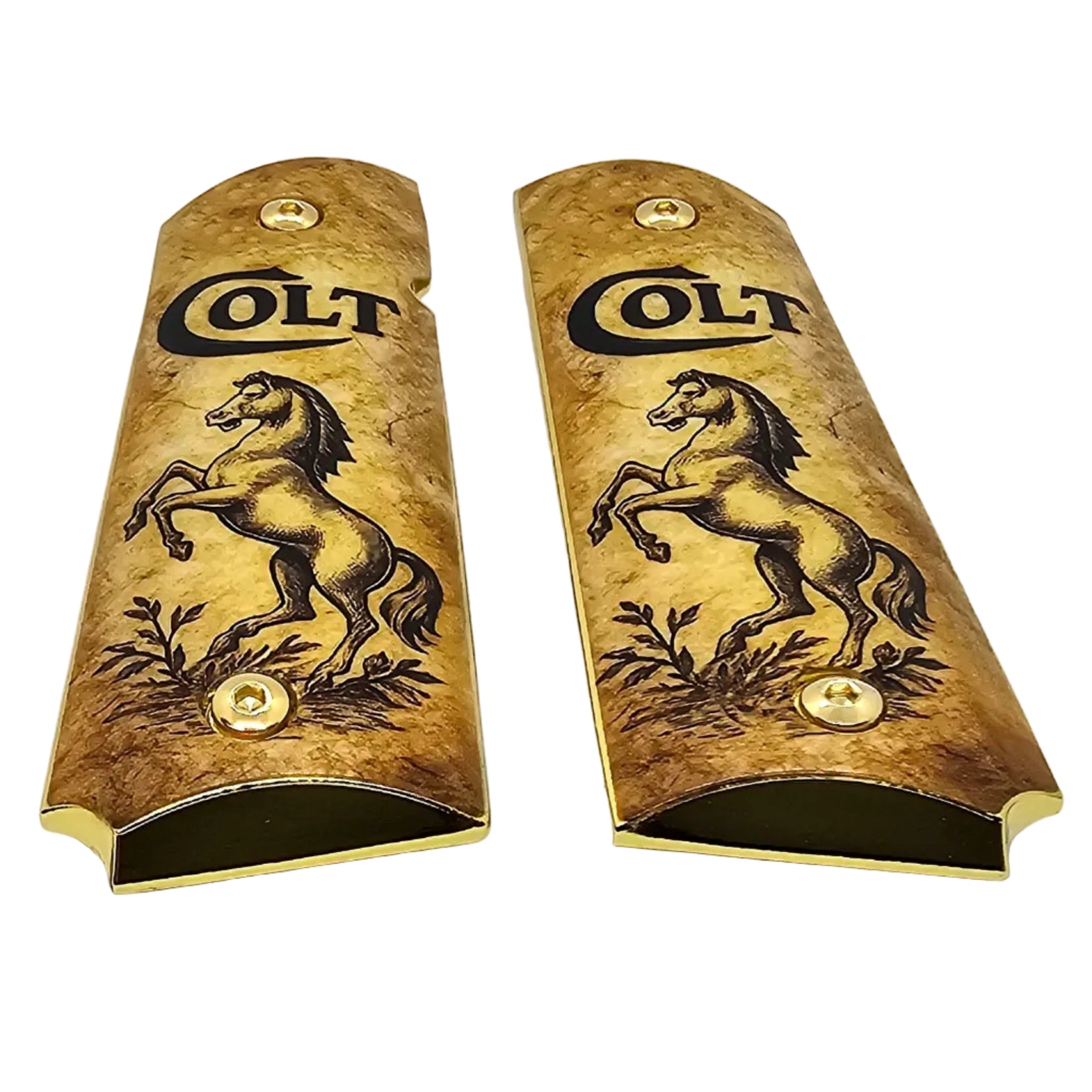 Upgrade your 1911 with these premium full-size metal grips, featuring the iconic Colt Horse design on a vintage parchment-style background. Perfect for enthusiasts who appreciate a bold, historic look.