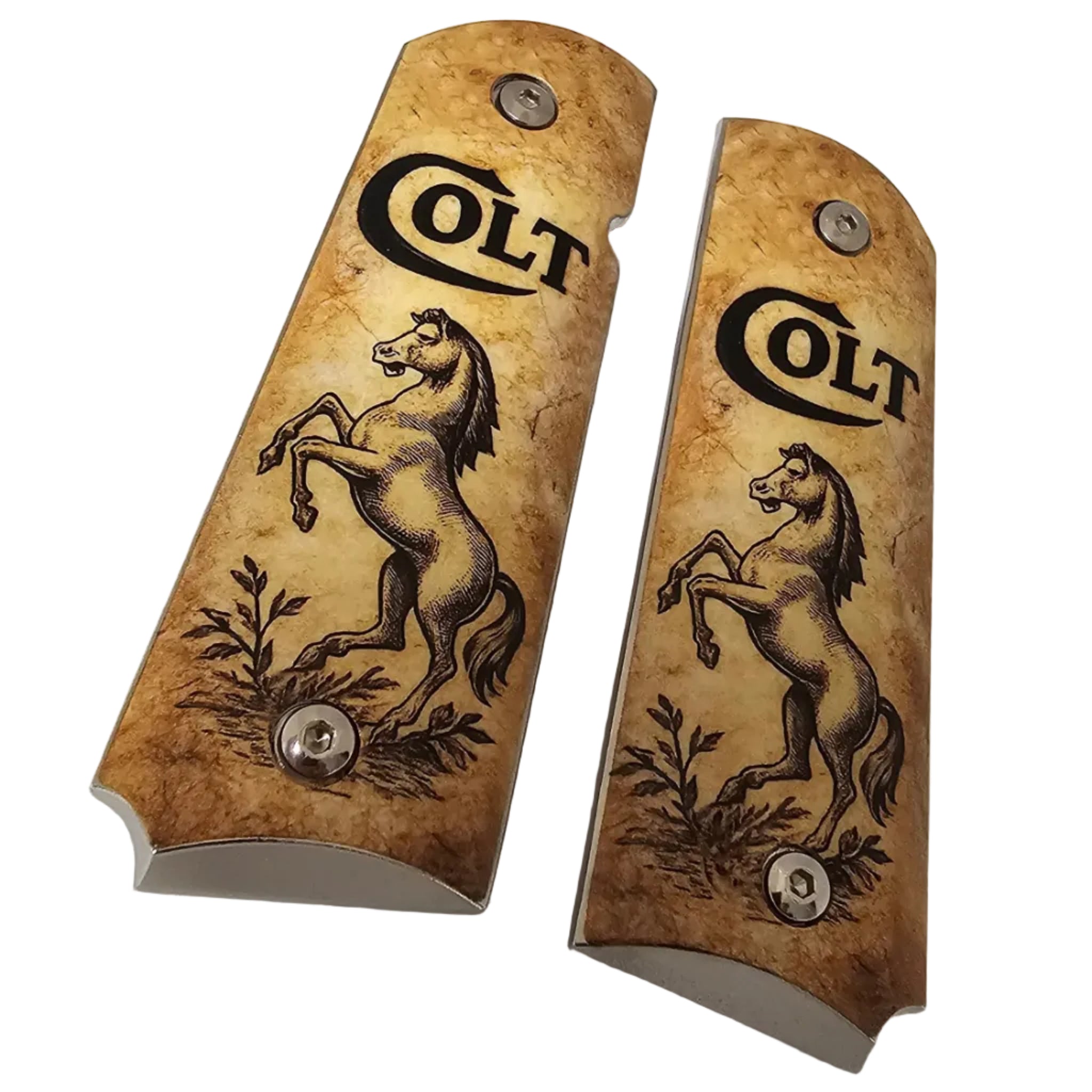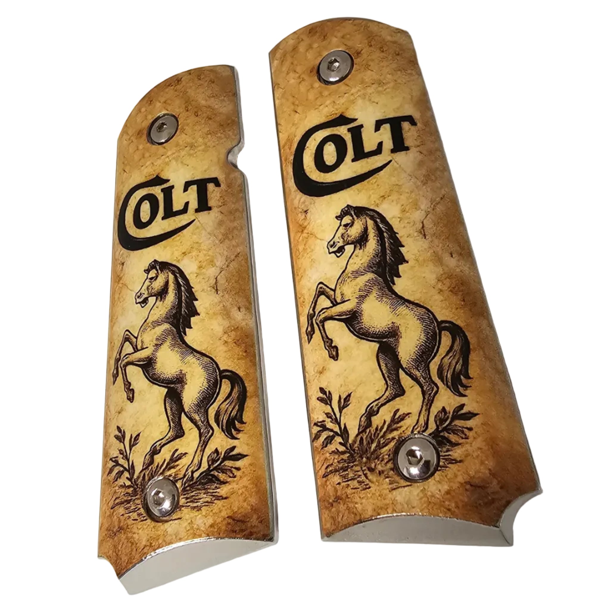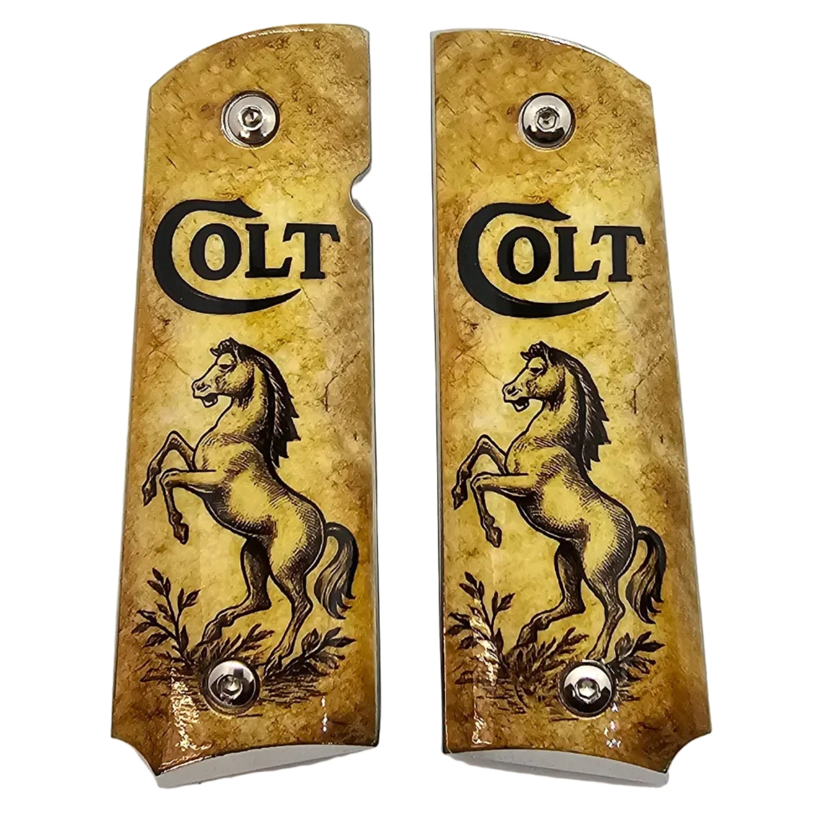 Upgrade your 1911 with these premium full-size metal grips, featuring the iconic Colt Horse design on a vintage parchment-style background. Perfect for enthusiasts who appreciate a bold, historic look.
