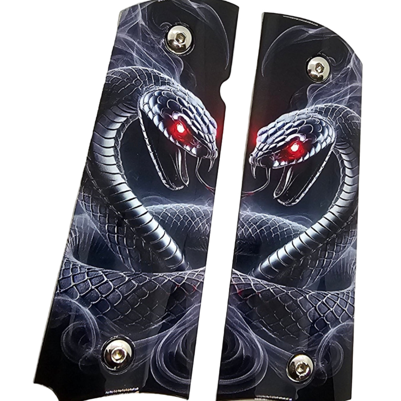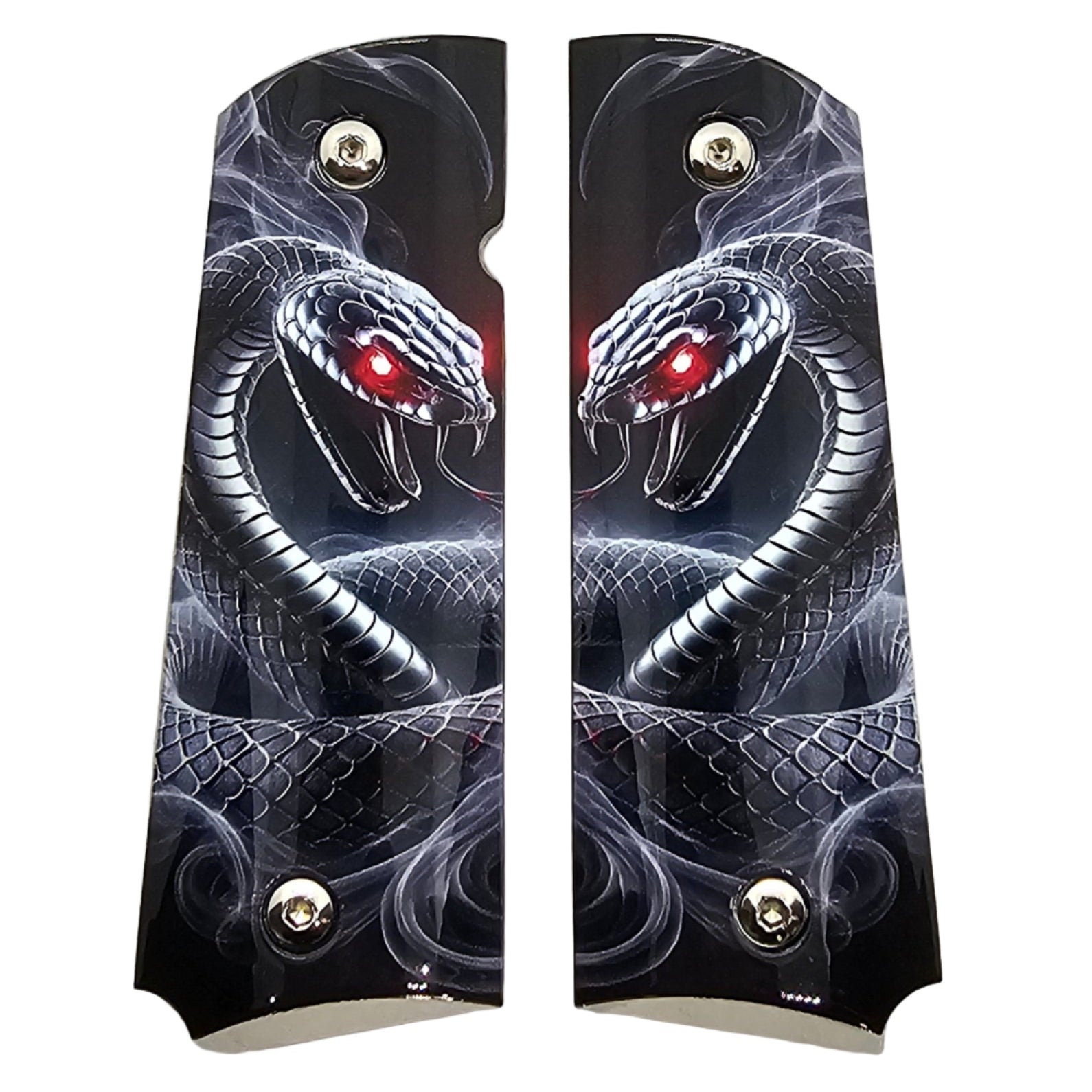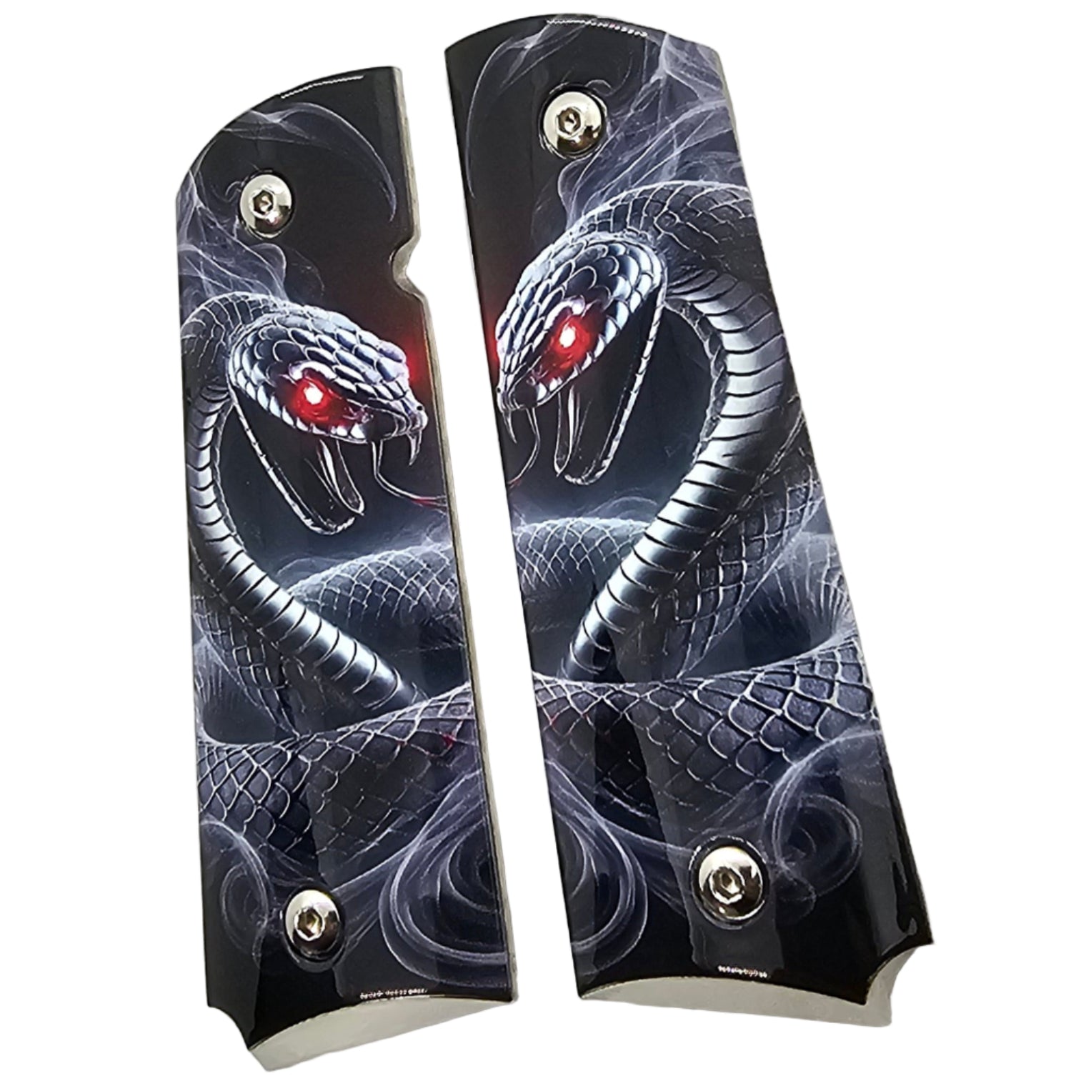 Command attention and respect with these 1911 full-size metal grips featuring an intense dual cobra snake design. The pair of coiled serpents are depicted in stunning detail with glowing red eyes, emerging from swirling smoke against a sleek nickel background. The bold design is perfect for firearm owners who want their pistol to make a serious statement.
