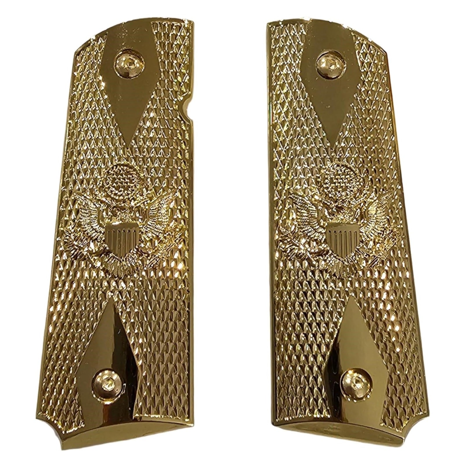 Command attention with these Full Gold Great Seal 1911 Metal Grips — the ultimate symbol of luxury and patriotism. Featuring the raised Great Seal of the United States on a fully gold-textured surface, these grips deliver unmatched shine and authority. Crafted from heavy-duty metal alloy for durability and precision fit, they combine American heritage with premium craftsmanship, perfect for collectors and display enthusiasts alike.