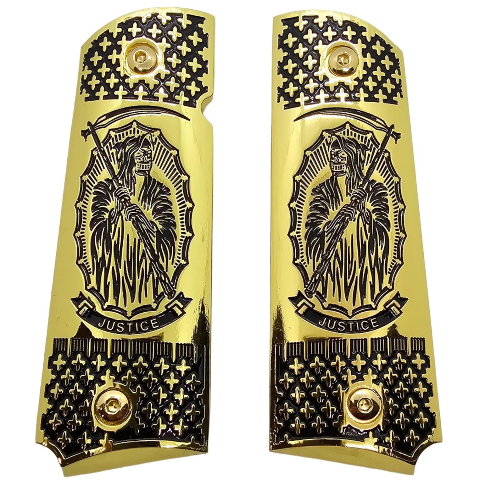 Add bold symbolism and high-end style to your 1911 with these Gold & Black Justice Reaper Metal Grips. Featuring a detailed engraving of the Reaper holding the scales of justice, these grips combine striking artistry with rugged craftsmanship. The reflective gold finish contrasts perfectly with deep black accents, creating a fierce yet refined look. Crafted from durable cast metal alloy, they deliver both performance and presence.