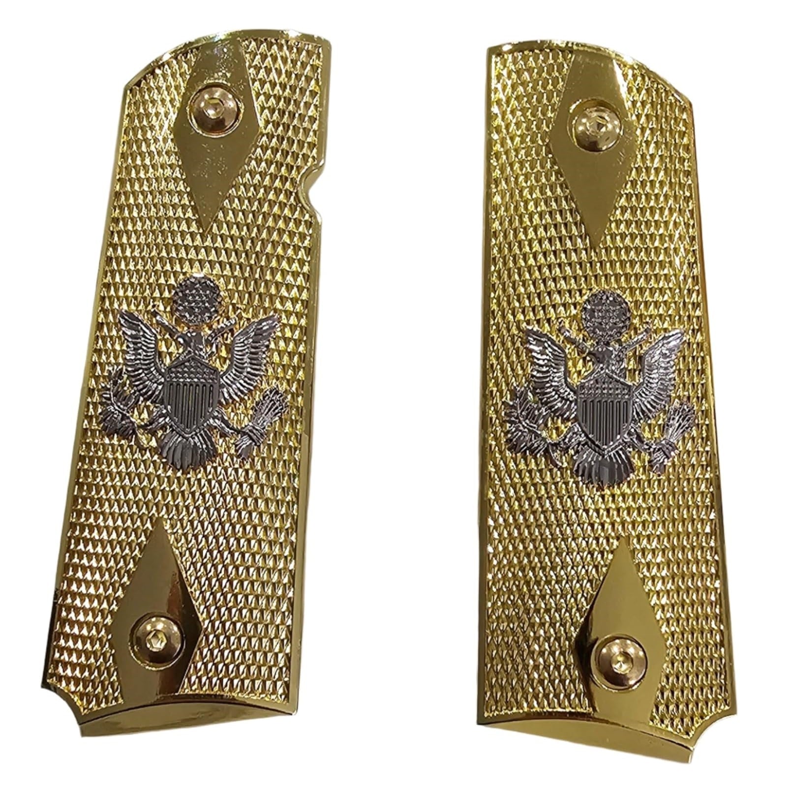 Showcase classic American strength with these Gold Great Seal 1911 Metal Grips. Featuring the detailed Great Seal of the United States on a precision-textured gold surface, these grips combine elegance and patriotism in one bold design. The durable cast metal alloy construction ensures long-lasting reliability and superior handling, while the high-polish finish adds a luxurious touch to your 1911.