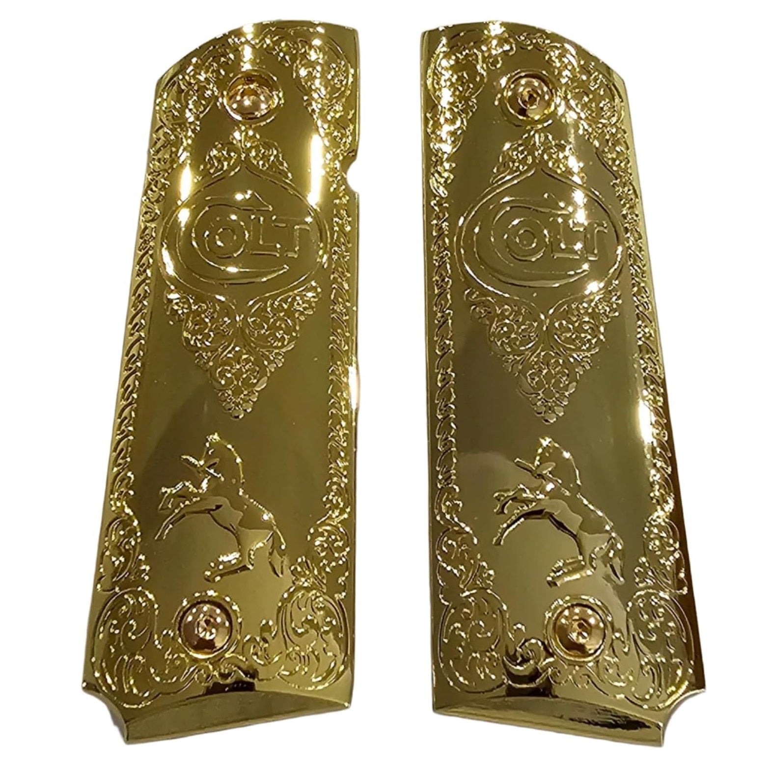 Upgrade your 1911 with these premium full-size metal grips featuring a gold-plated finish and detailed Colt horse and logo engraving. Designed for both style and performance, these grips offer a perfect fit and solid feel.