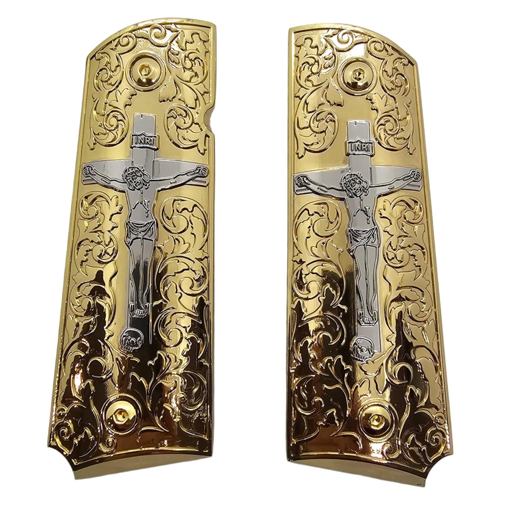 Elevate your 1911 with these Gold & Silver Crucifix Metal Grips, blending faith and craftsmanship in a striking two-tone finish. Made from durable cast metal alloy, these grips feature a detailed silver crucifix centerpiece surrounded by ornate gold scroll engraving. The mirror-polished surface offers a bright, elegant look while providing a solid, comfortable hold.